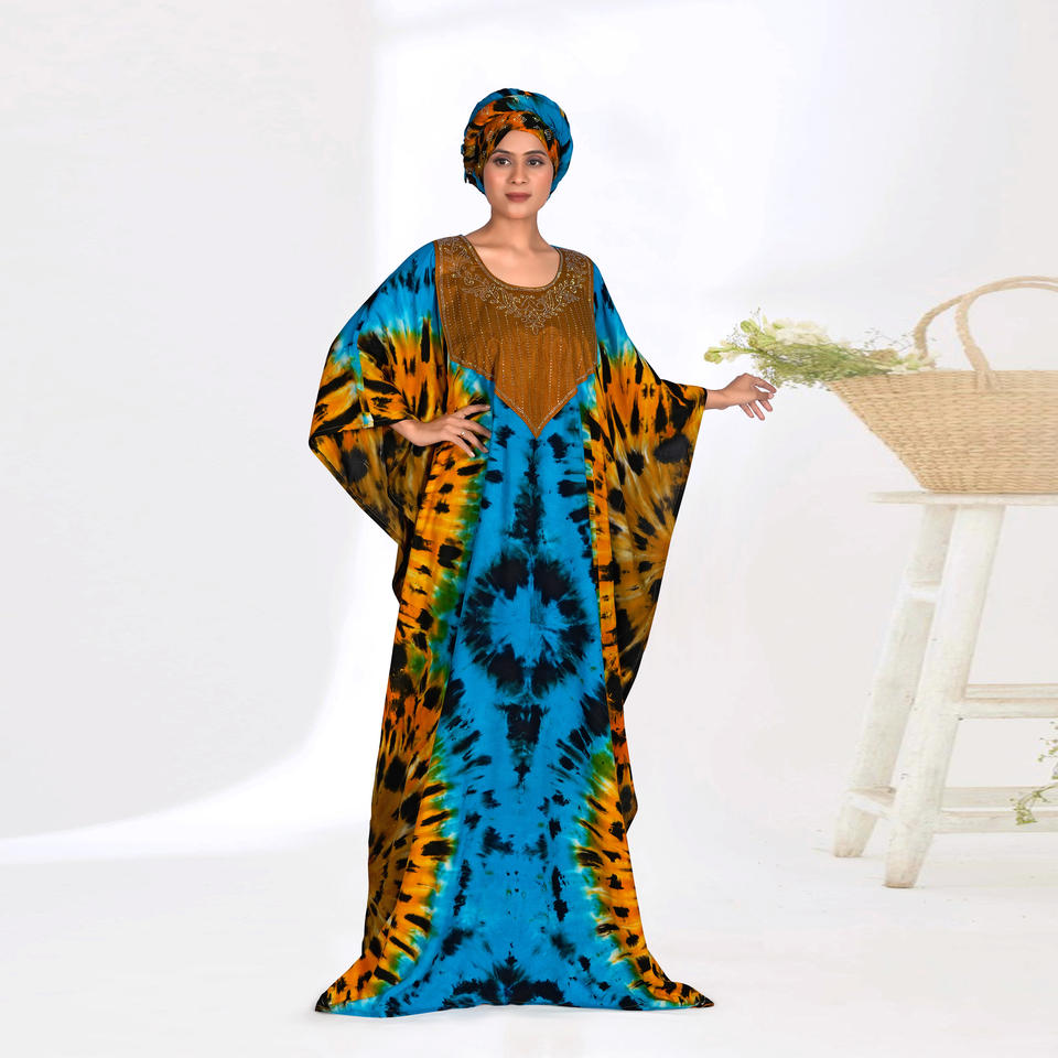 ชุดราตรีเรยอนฟาราชาแบบคัฟตัน ไซส์พลัส ลายมัดย้อมสีพื้น แต่งดีเทลที่คอ ทรงหลวมพลิ้วไหว สง่างาม ยาวคลุมเท้า