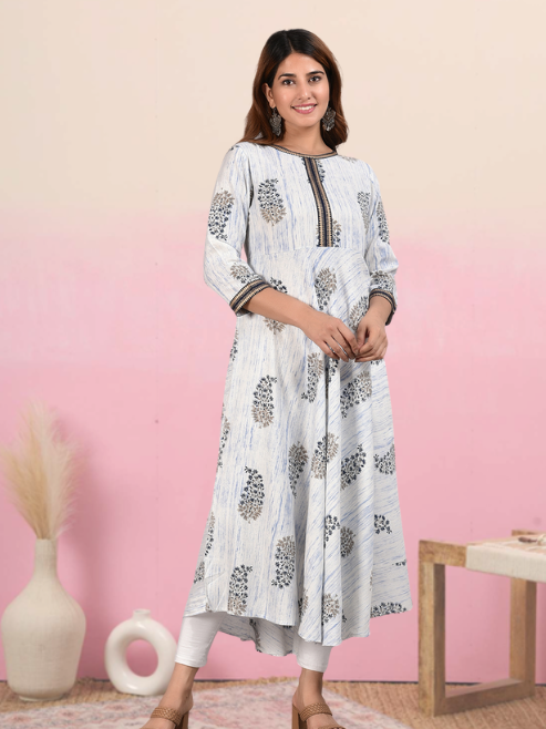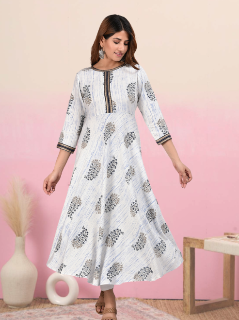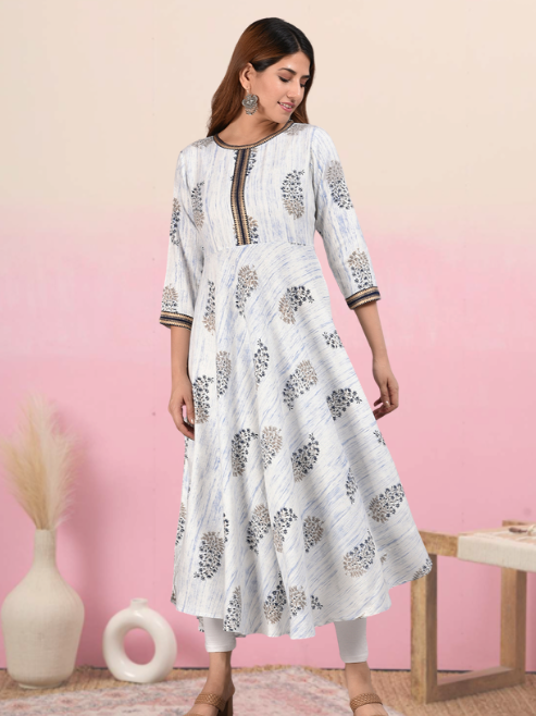 ชุดอานาร์กาลีผ้าเรยอนพิมพ์ลายดอกไม้สีขาว ทรงบาน สไตล์ชาติพันธุ์ ลำลอง สำหรับงานเทศกาล งานปาร์ตี้ ใส่ได้ในฤดูร้อน แห้งเร็ว สำหรับผู้หญิง