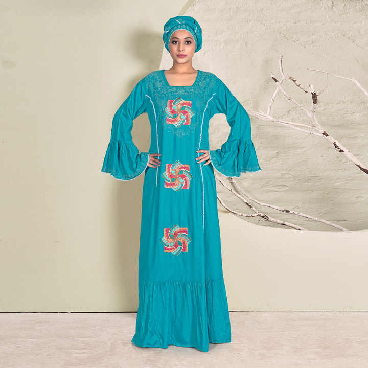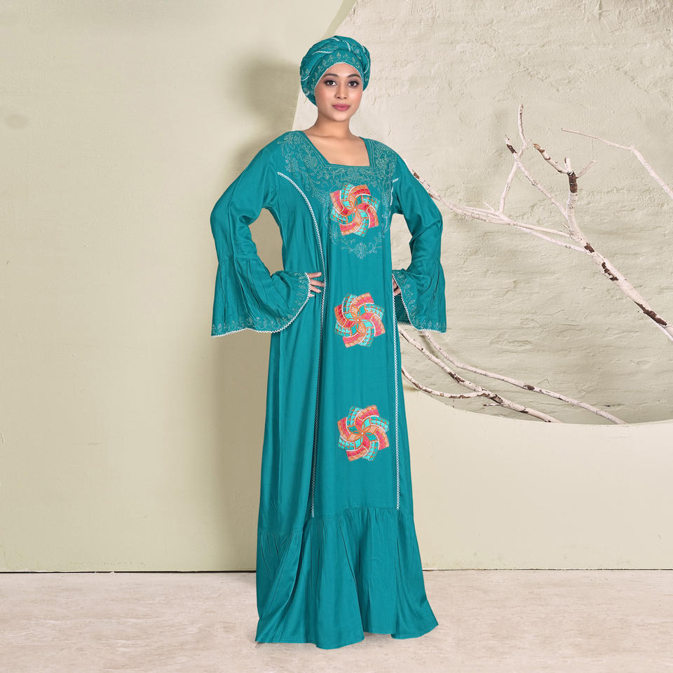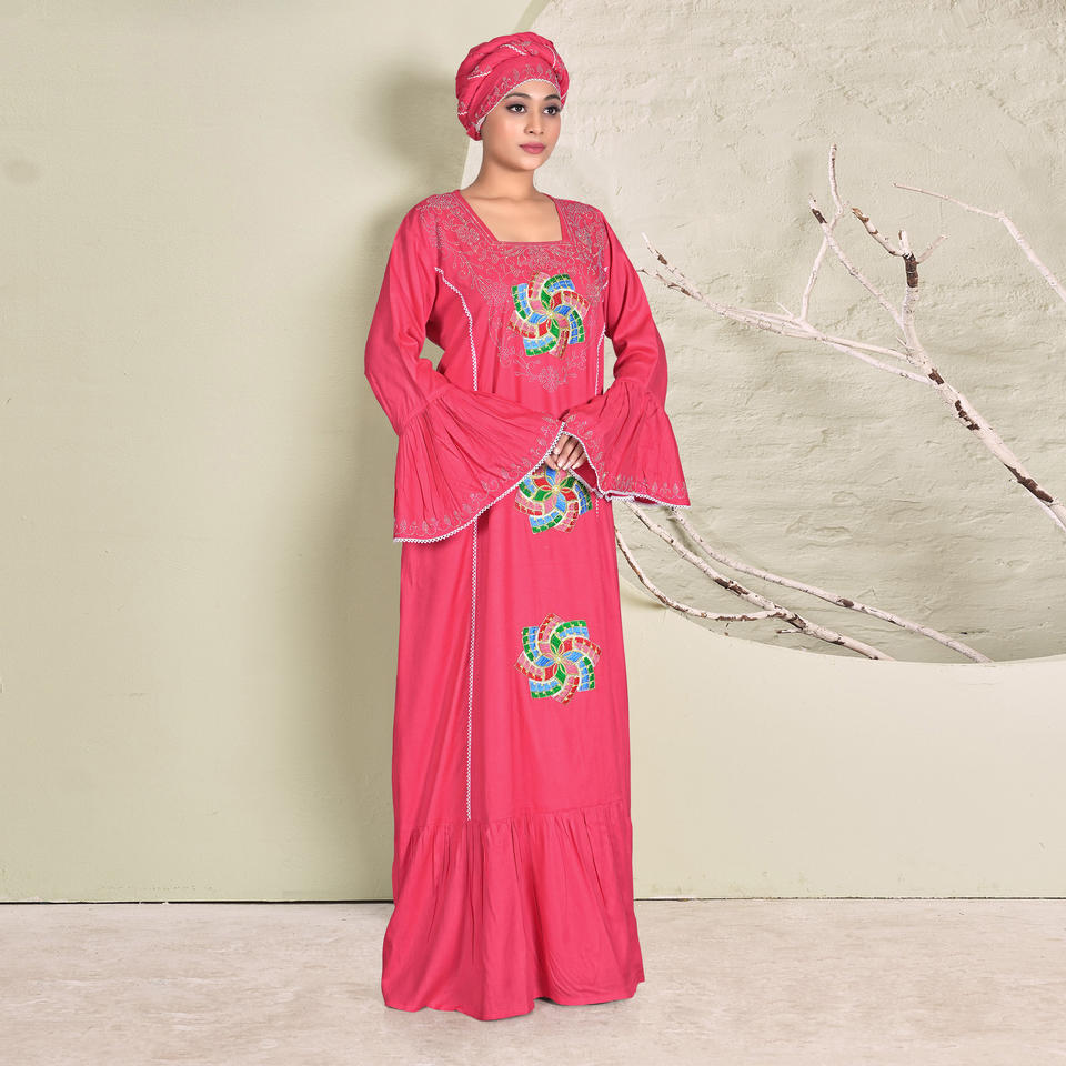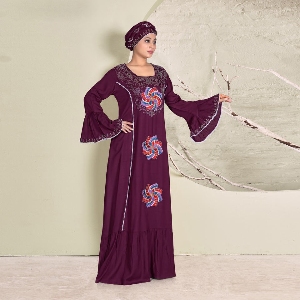 ชุดคาฟตันผ้าเรยอนปักลายประณีต พร้อมดีเทลลายฉลุซ้อนกัน ชายกระโปรงบานทรงระฆัง แขนเสื้อทรงระฆัง และทรงยาวกรอมพื้นอย่างสง่างาม