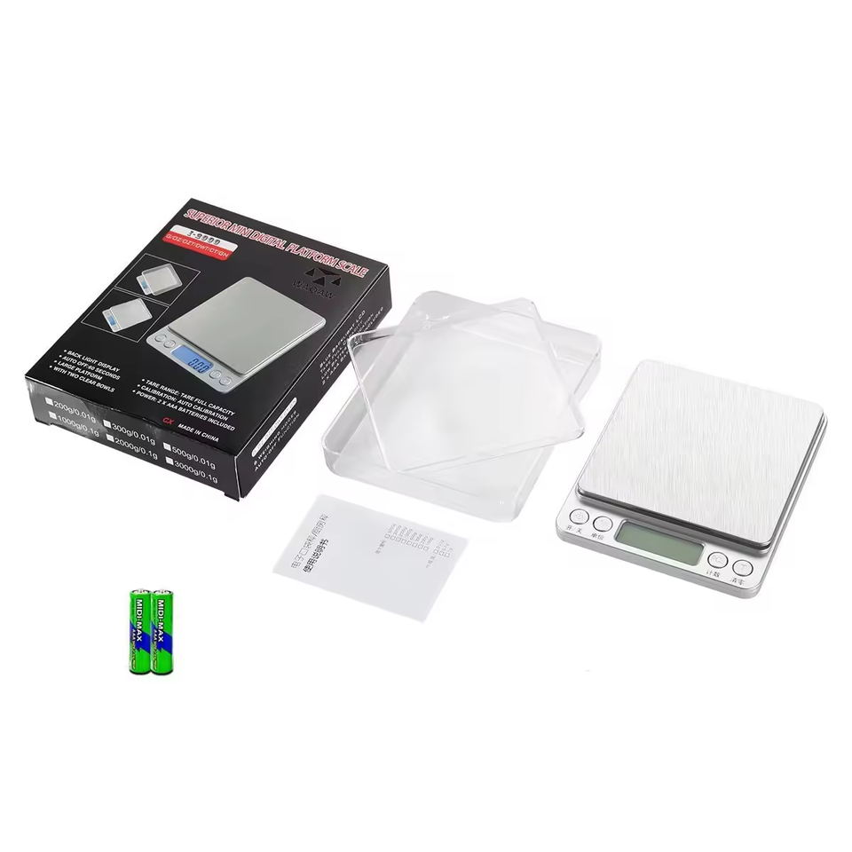 เครื่องชั่งดิจิตอลพกพา Rays CE RoHS พร้อมฝาปิดและถาด ชั่งน้ำหนักได้ 1กก. 2กก. 3กก. ความละเอียด 0.1กรัม 0.01กรัม ใช้แบตเตอรี่ รุ่น I-2000