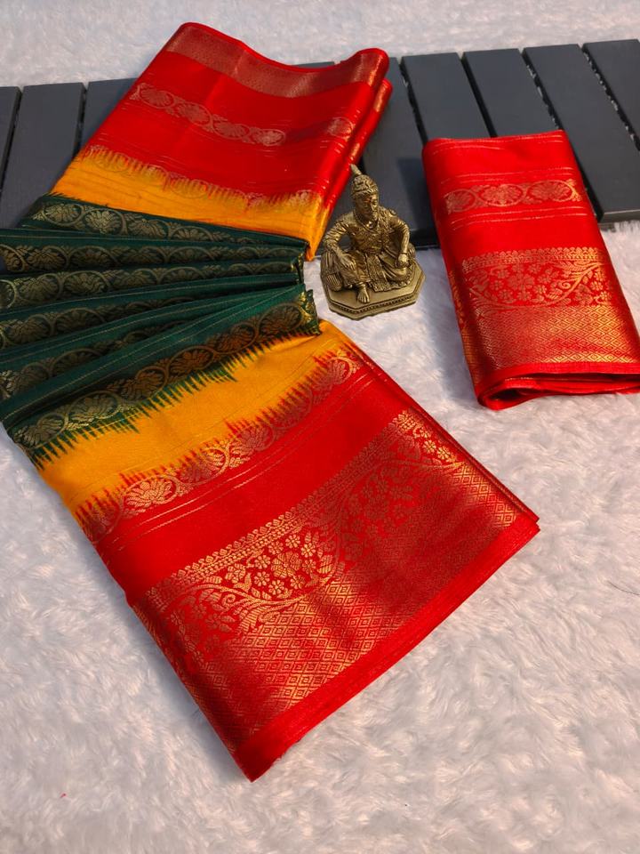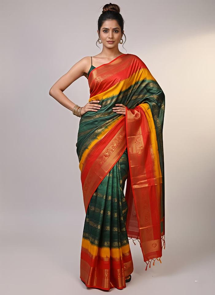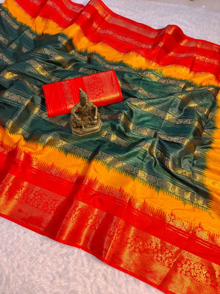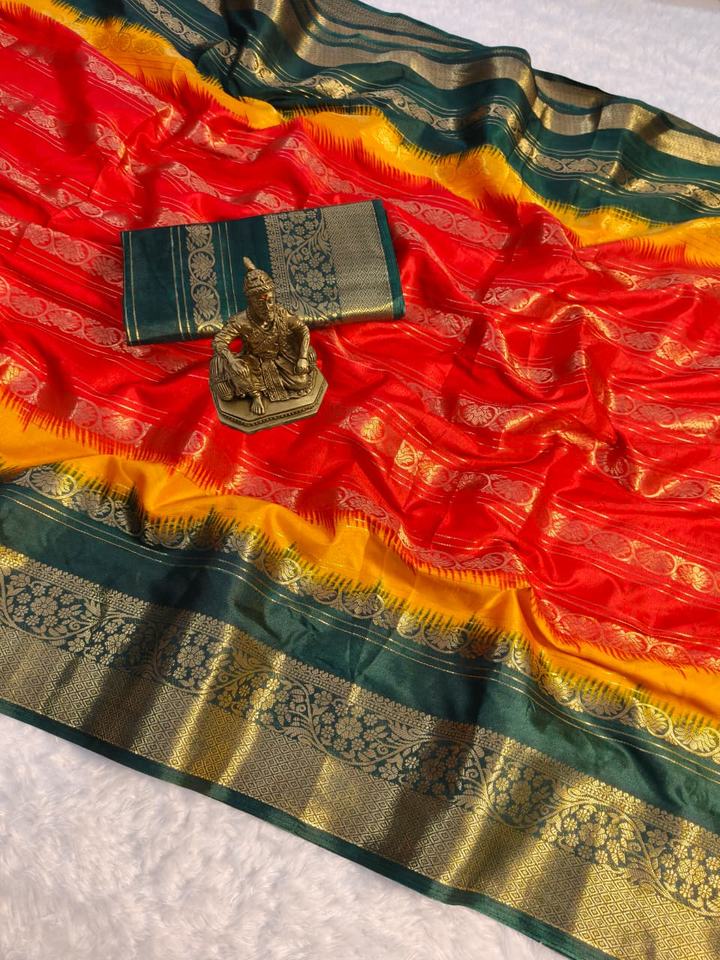 ผ้าซารีราซีอา แจ็คการ์ด ทอลายแจ็คการ์ดทั้งผืน ขอบและพาลลูสีทอง ผลิตในอินเดียสำหรับผู้หญิง
