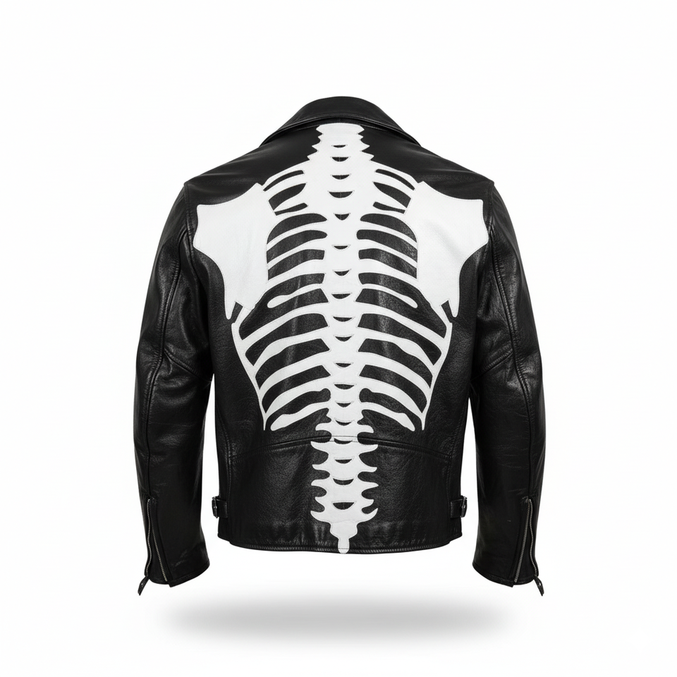 เสื้อแจ็กเก็ตหนังรถจักรยานยนต์ลายกระดูกสไตล์ฮาโลวีนทำจากหนังวัวแท้สำหรับฤดูหนาวให้ความอบอุ่นสบาย