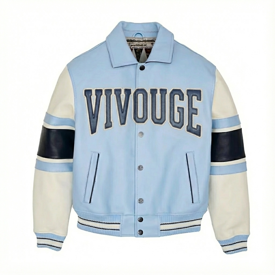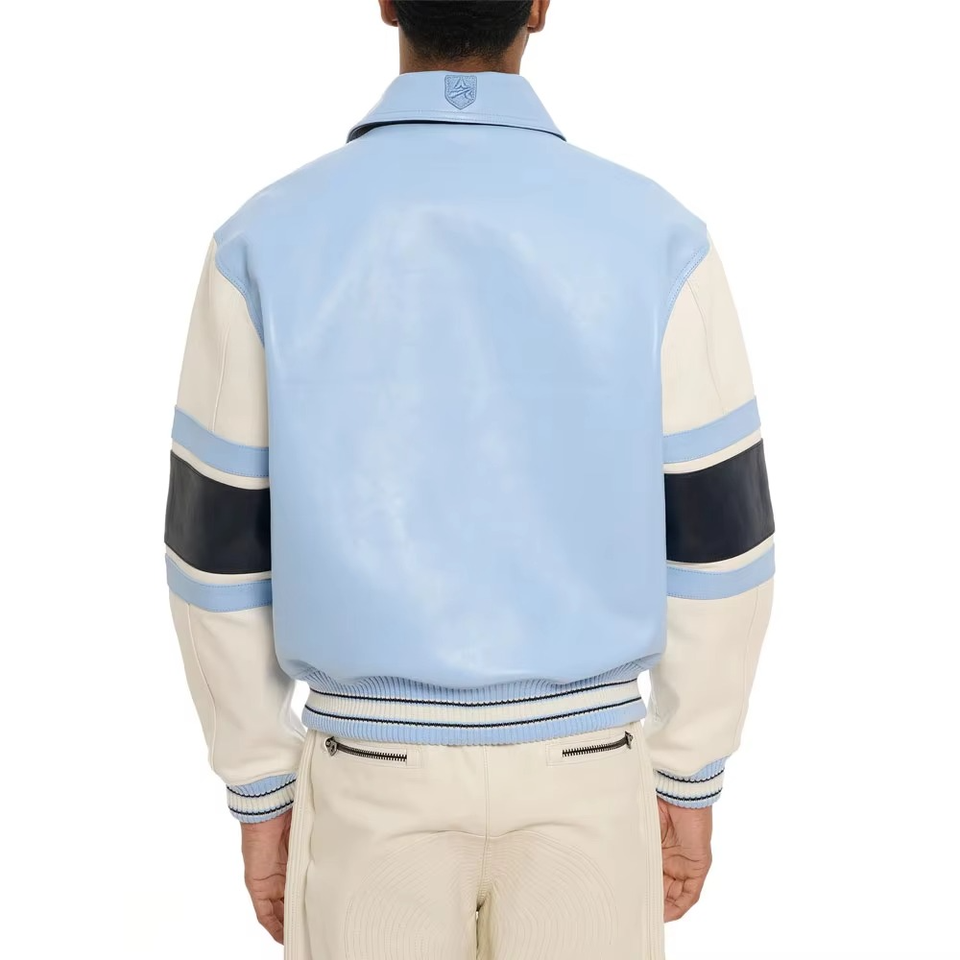 เสื้อแจ็คเก็ตผู้ชายสีฟ้าอ่อน ผ้าขนสัตว์/วิสโคส ทรงหลวม ไหล่ตก ดีไซน์ทันสมัย ซิปและกระดุม กระเป๋าคู่ สไตล์ไบค์เกอร์ บอมเบอร์ วาร์ซิตี้ สำหรับฤดูหนาว พร้อมส่ง