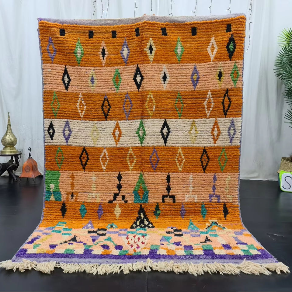 พรมปูพื้นขนแกะสไตล์โมร็อกโกพรมทรงเรขาคณิตแนวโบฮีเมียนแฮนด์เมดสีส้มแนววินเทจแนวแอบสแตรก