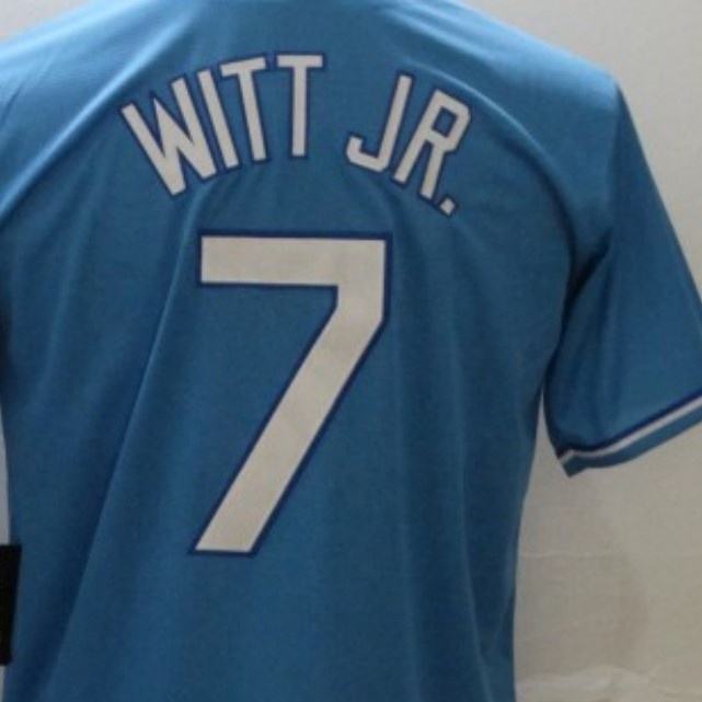 เสื้อเบสบอลคุณภาพเยี่ยม ปักอย่างดี สีฟ้าอ่อน ของบ็อบบี้ วิทท์ จูเนียร์ จากแคนซัสซิตี้ พร้อมส่ง