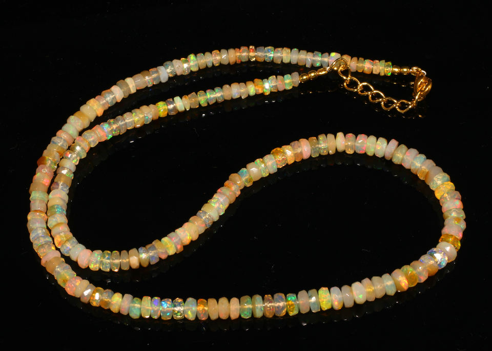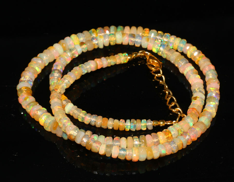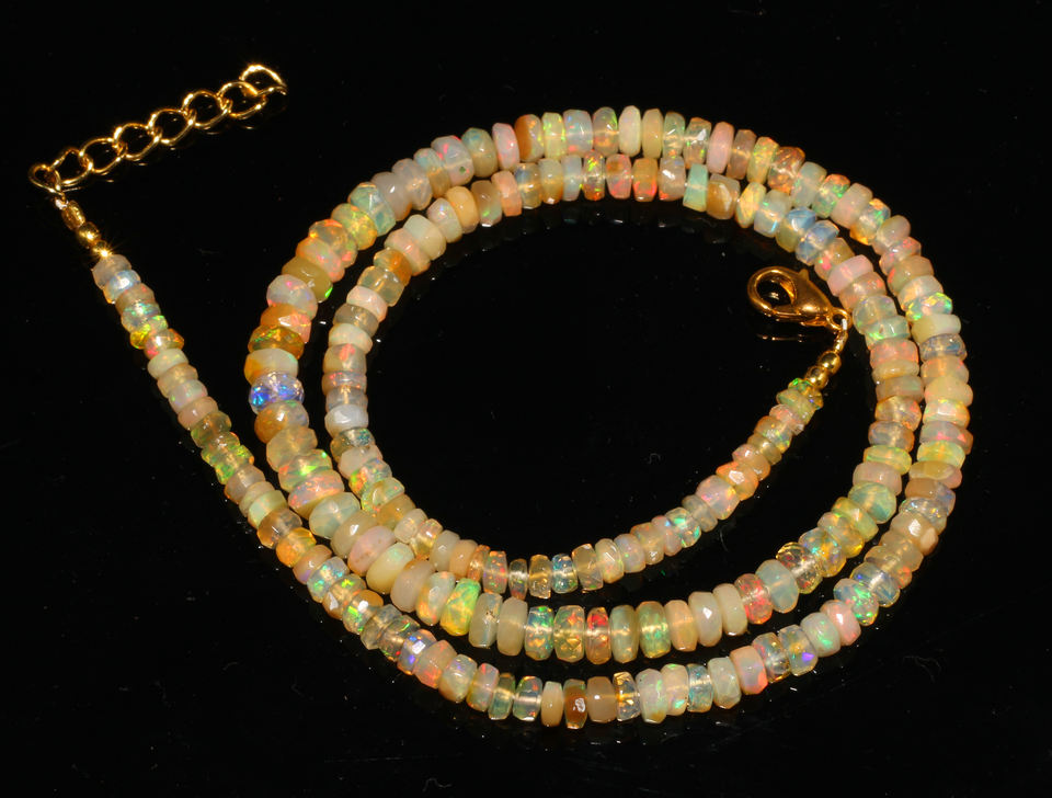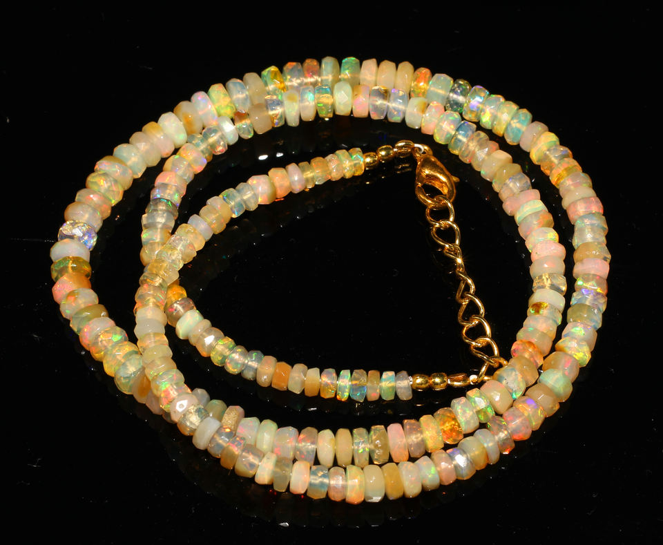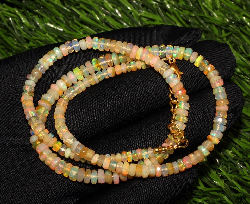 ลูกปัดโอปอลเอธิโอเปียธรรมชาติทรงรอนเดลเหลี่ยมเพชรพลอย พร้อมส่ง ขนาด 3.5-5 มม. ความยาว 18 นิ้ว น้ำหนัก 42.45 กะรัต สีรุ้ง