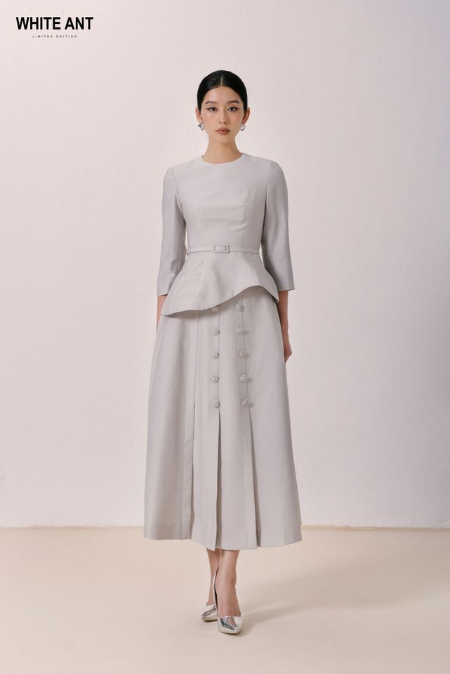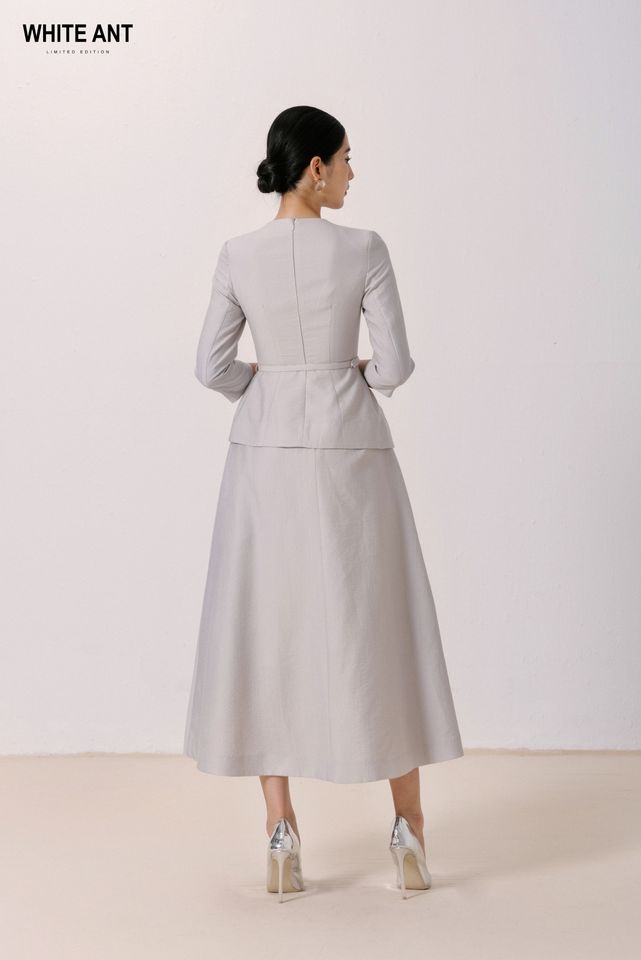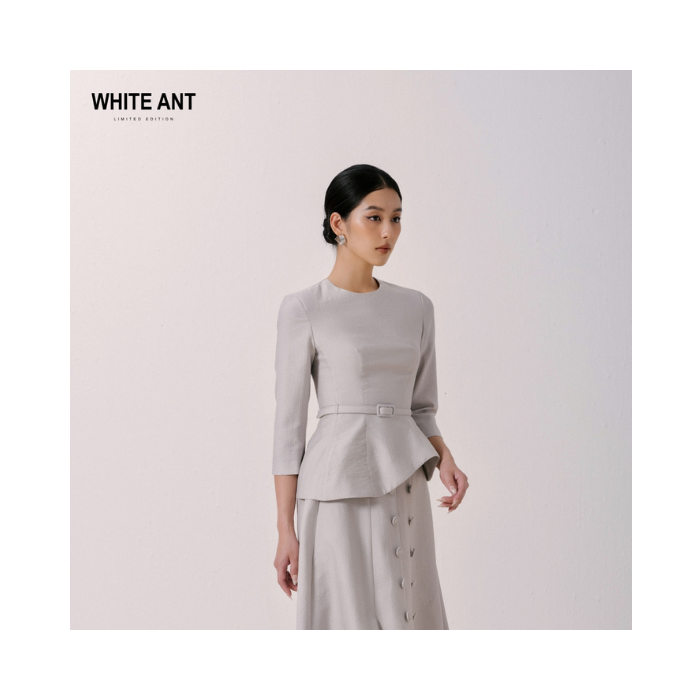 เสื้อเบลาส์ผู้หญิงพร้อมเข็มขัด, เสื้อเบลาส์คอกลมแขนยาวสำหรับสาวออฟฟิศสีขาวมด