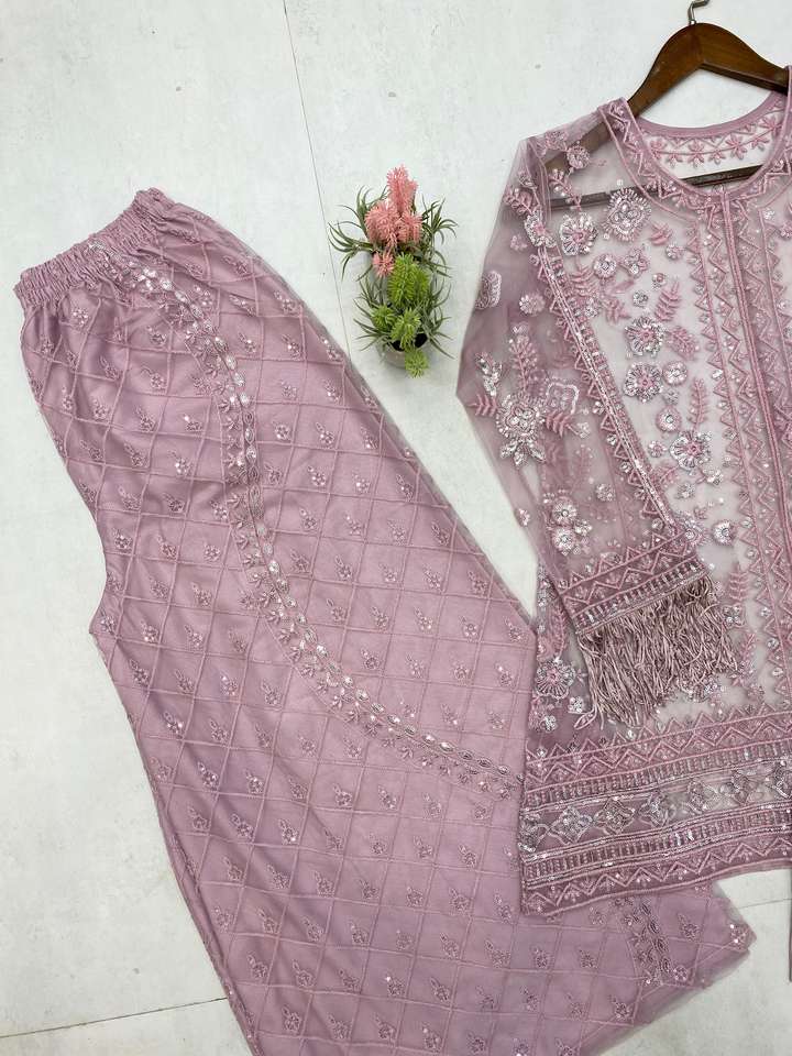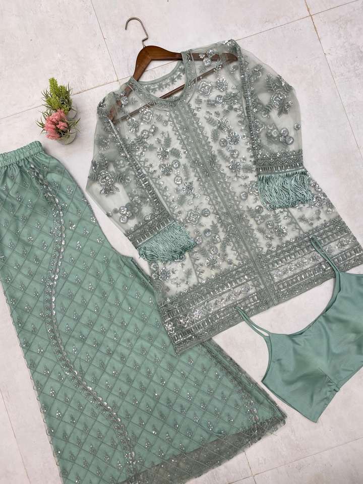 ชุดตาข่ายไมโครลายผีเสื้อสไตล์บอลลีวู้ดและ Plazo ชุดเรียงตามลำดับขนาดงาน M ถึง XXL สำหรับงานปาร์ตี้