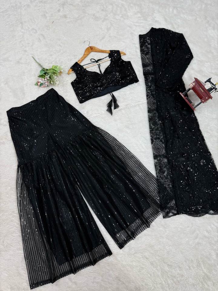ชุดแต่งกาย lehenga Saree พร้อมด้วย choli shruga และ plazo สีดำนิ่มลายผีเสื้อเสื้อผ้าอินเดียและปากีสถาน