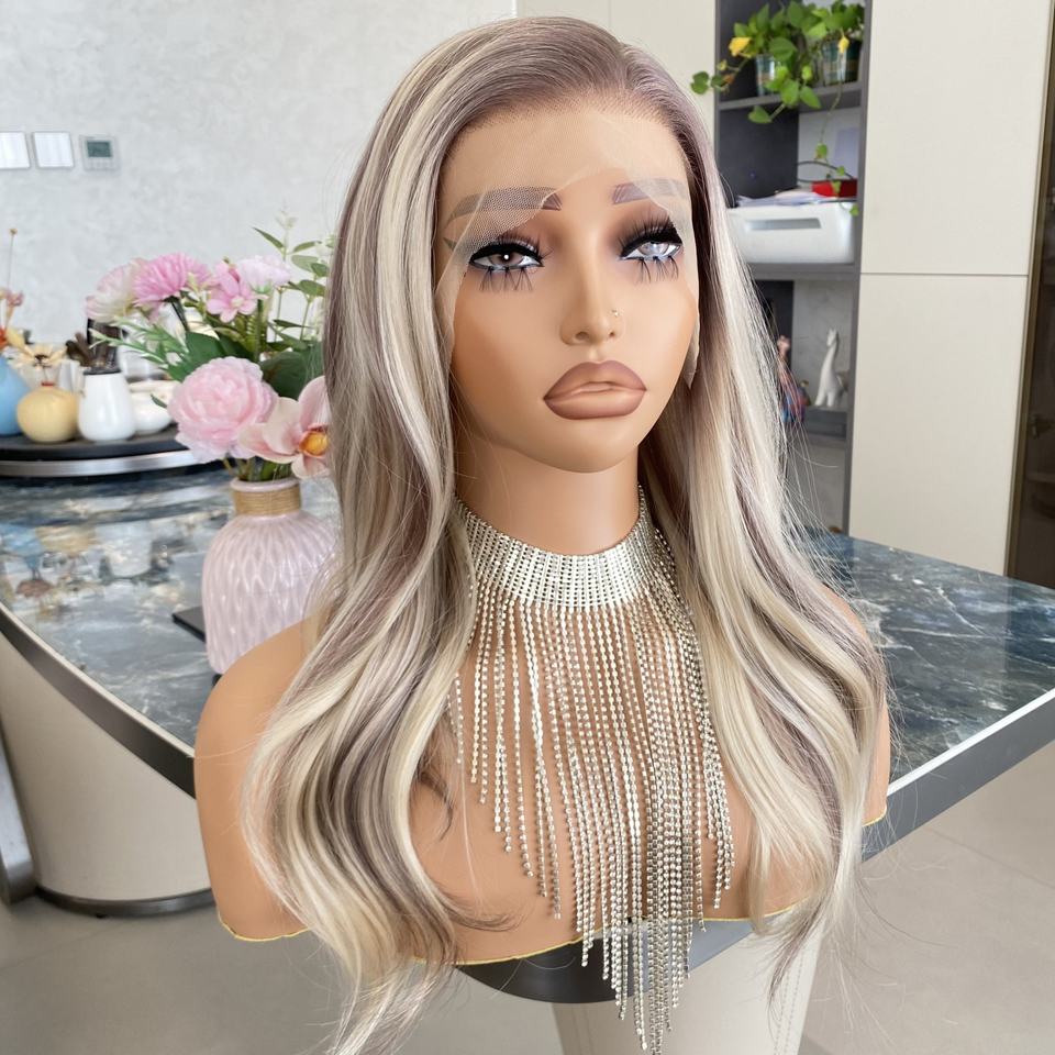 วิกผมสังเคราะห์แบบไม่ต้องใช้กาว ความยาวปานกลาง สีบลอนด์น้ำตาล พร้อมลูกไม้ด้านหน้า ลอนคลาย ไรผมดูเป็นธรรมชาติ สำหรับผู้หญิงผิวขาว