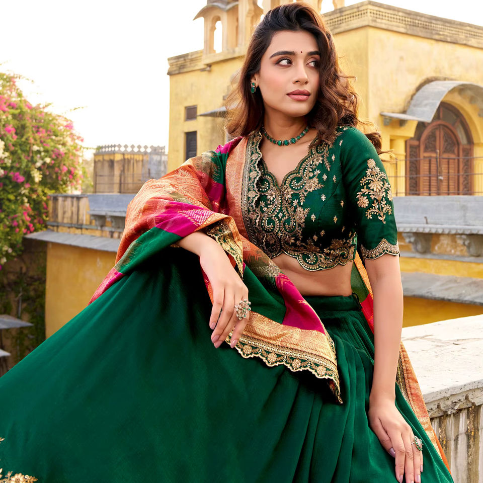 ชุดเลเฮนกาโชลีสำเร็จรูปสไตล์อินเดียพร้อมผ้าคลุมไหล่ ผ้าไหมเนื้อนุ่มปักลายเลื่อม เหมาะสำหรับงานแต่งงาน งานปาร์ตี้ ชุดสไตล์บอลลีวูด