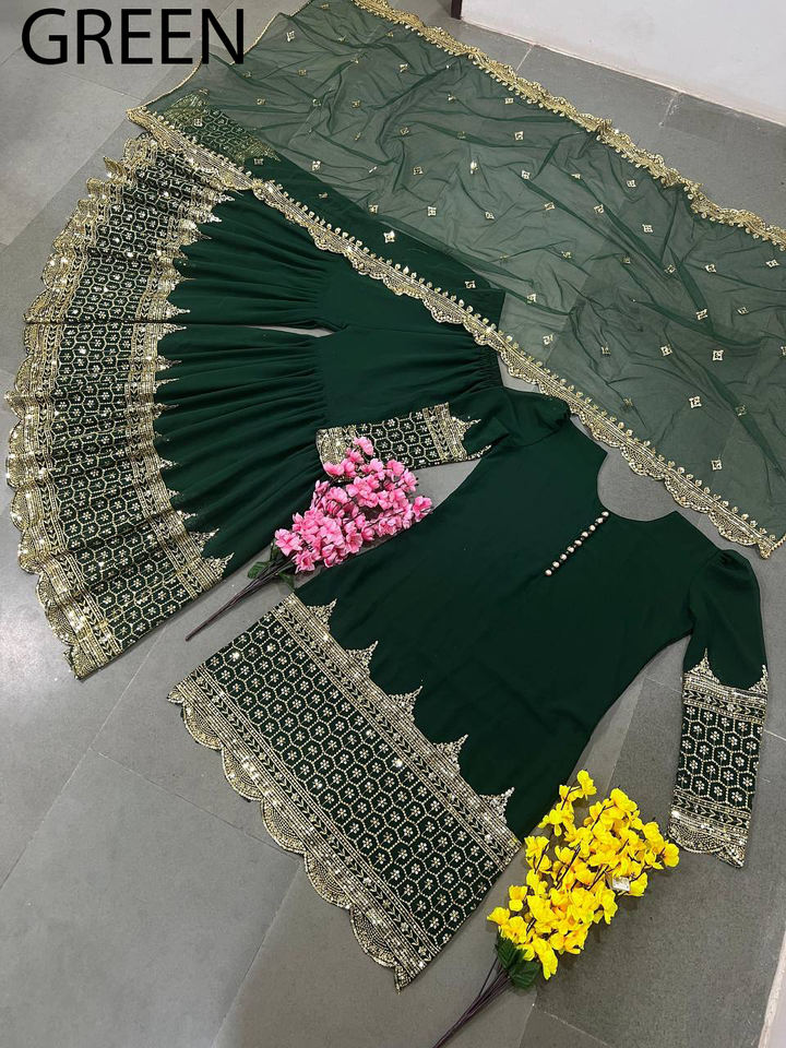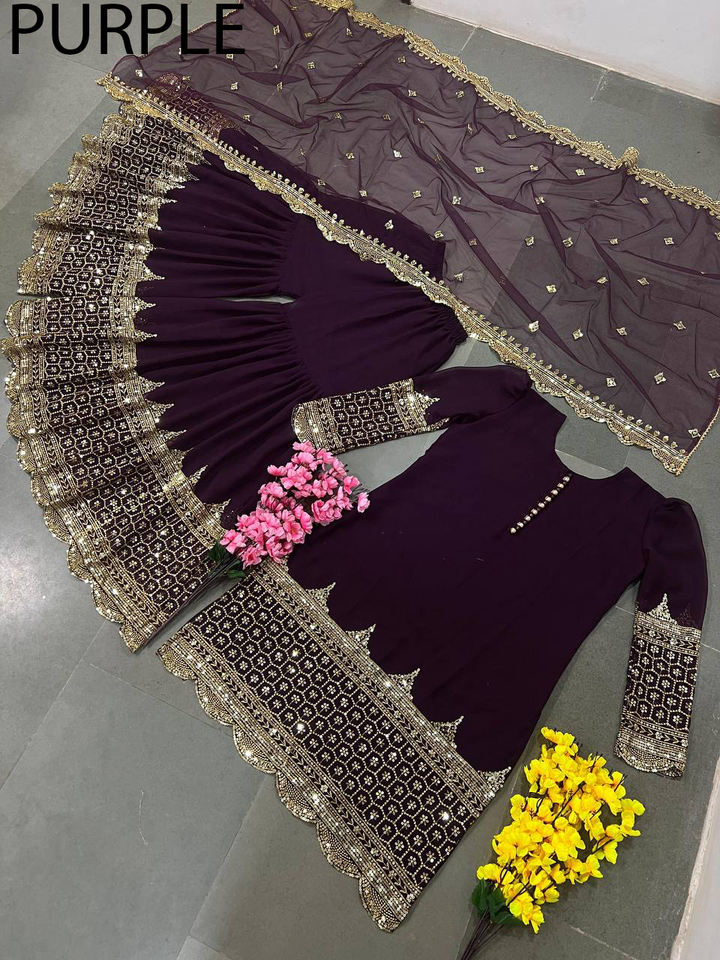 ชุดเซ็ตเสื้อคุर्ติ ชาราร่า หรือ การารา งานปักอินเดียสำเร็จรูป ผ้าจอร์เจตต์ ตัดเย็บสำเร็จ ดีไซน์เนอร์ปากีสถาน เสื้อผ้าชาติพันธุ์ สำหรับงานปาร์ตี้หรืองานแฟนซี
