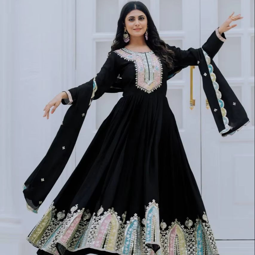 ชุด anarkali ผ้าไหม Chinon จริงสำหรับเด็กผู้หญิงชุดงานแต่งและงานแต่ง