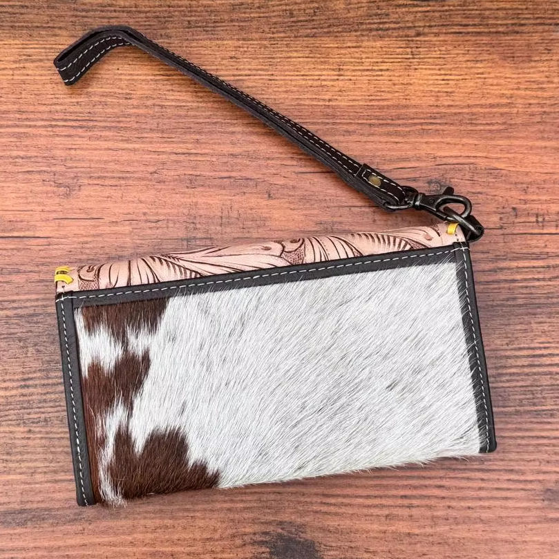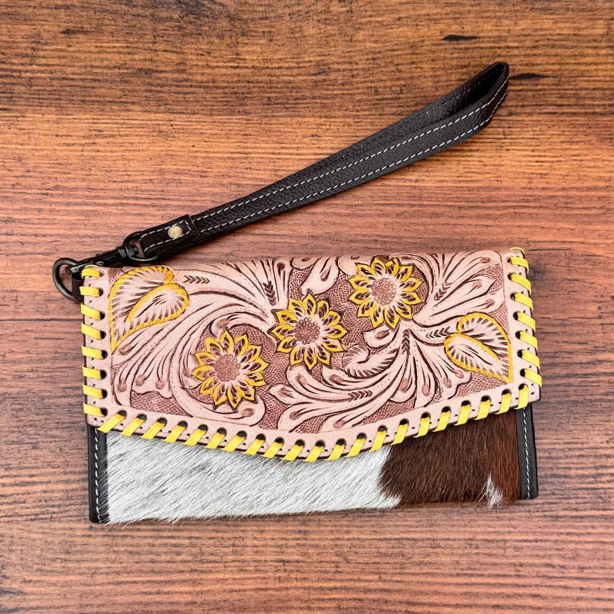 กระเป๋าคลัทช์ขนสัตว์หนังวัวสำหรับผู้หญิงกระเป๋าคลัทช์หนังสีเหลืองสลักลายดอกไม้