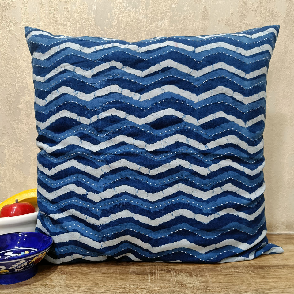 ผ้าฝ้ายวอยล์ 100% สีคราม ลายซิกแซก งานปักกันตะ ลายพิมพ์บล็อกด้วยมือ ปลอดสารพิษ ต้านเชื้อแบคทีเรีย ทำด้วยมือ ขนาด 45x45 ซม. ปลอกหมอนอิง