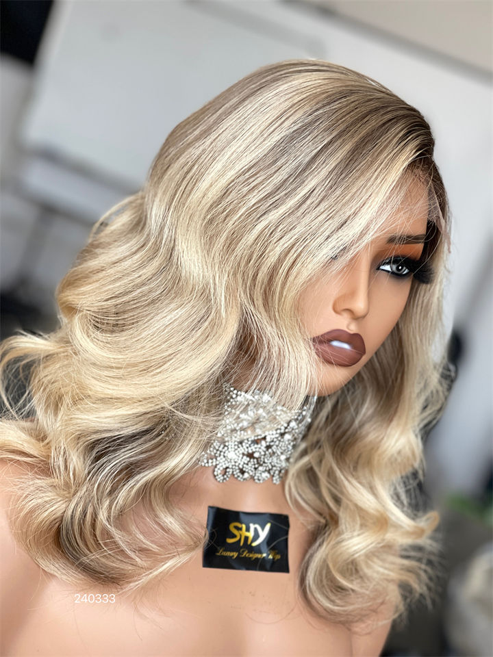 วิกผมจริงสไตล์ยุโรปสำหรับผู้หญิงผิวขาววิกผมลูกไม้ด้านหน้าโปร่งใส HD สั้นสีบลอนด์ balayage