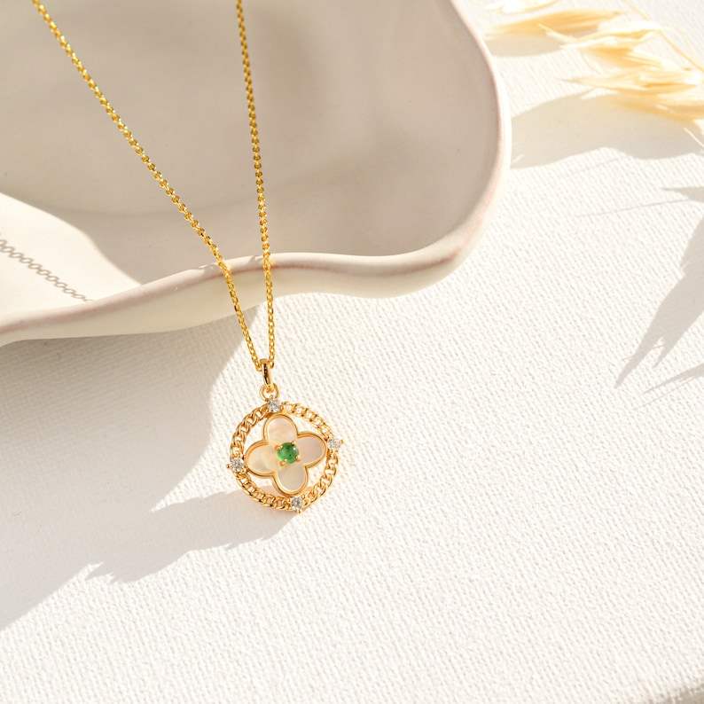 สร้อยคอหยกแท้ประดับมุก รูปโคลเวอร์ เงินแท้ 925 ชุบทอง 14K ดีไซน์ดอกไม้ จี้สำหรับเด็ก วันครบรอบวันแม่