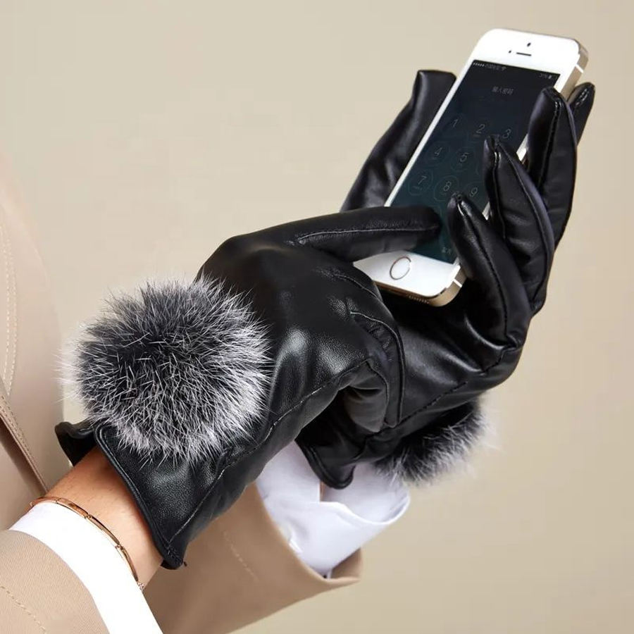 ถุงมือหนังแท้สำหรับหน้าหนาวสำหรับผู้หญิงถุงมือทัชสกรีนแฟชั่นสีดำอบอุ่นสำหรับกีฬากลางแจ้งแบบลำลอง