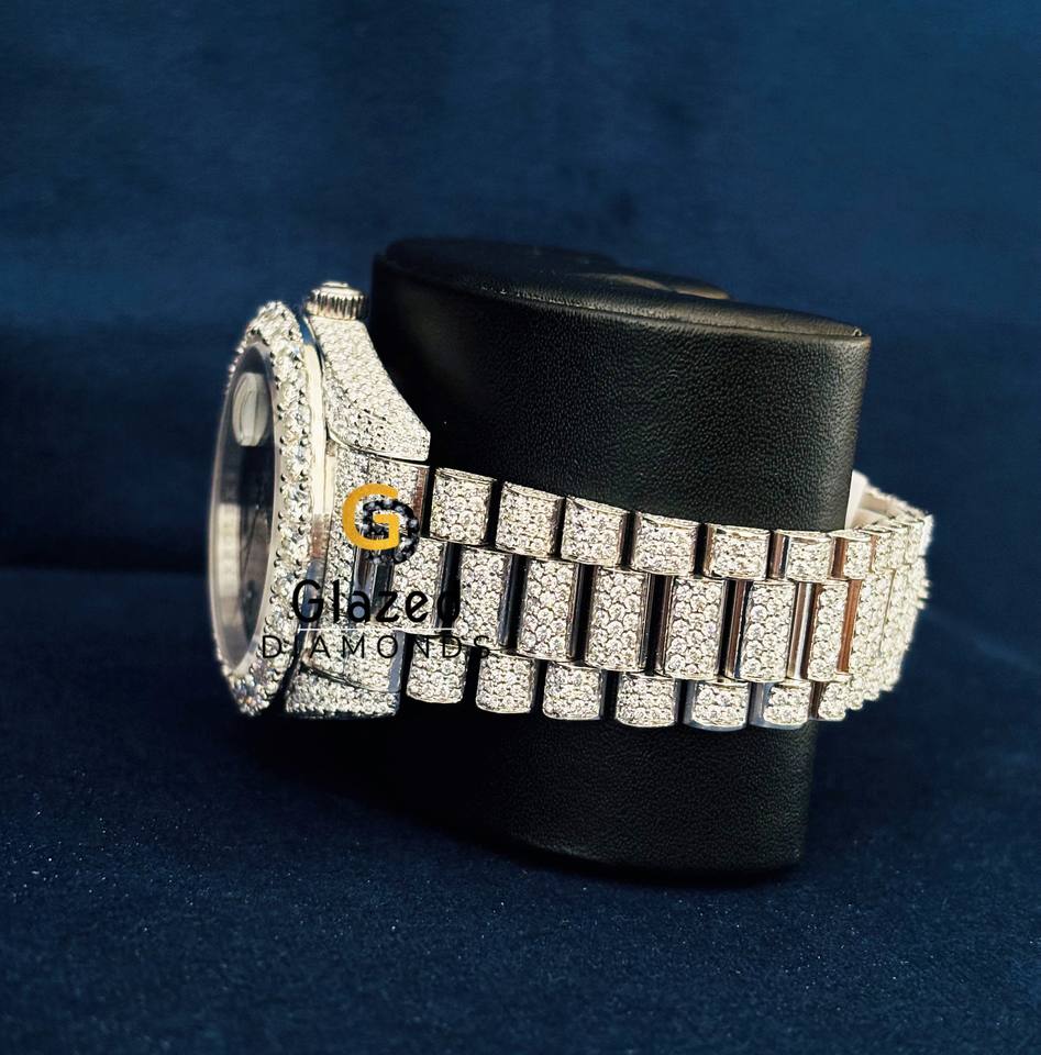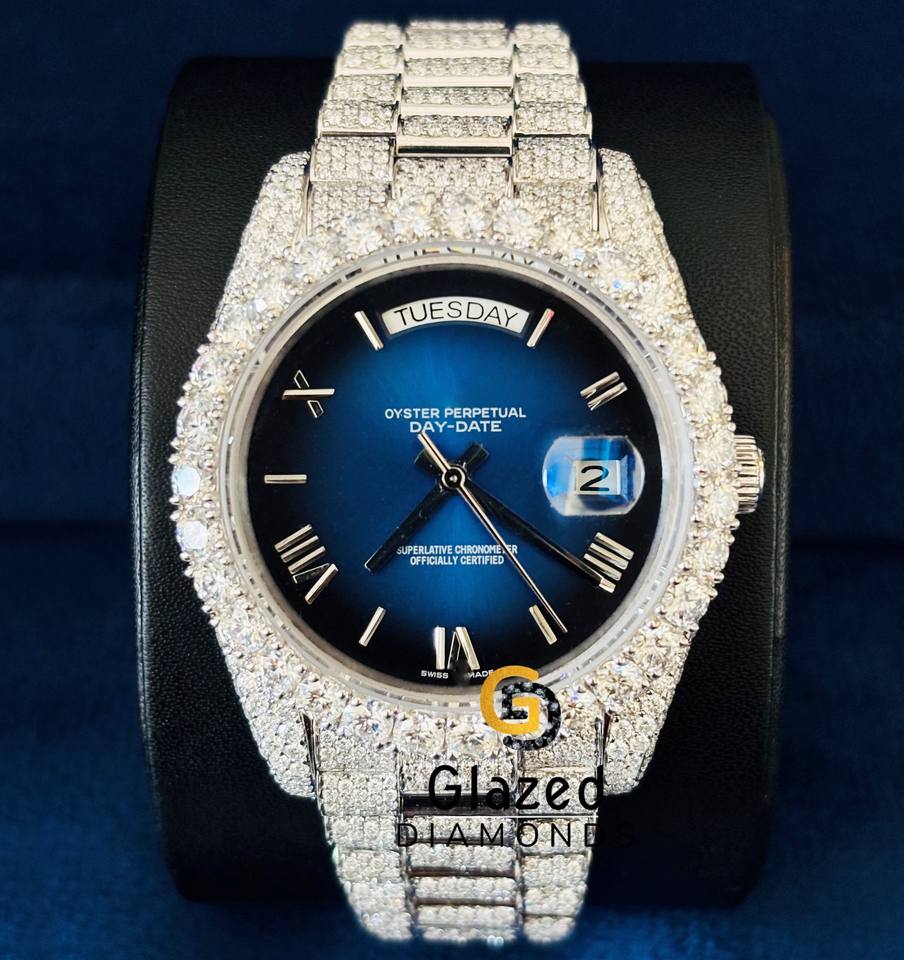 นาฬิกาข้อมือผู้ชายแบบอนาล็อก หน้าปัดสีน้ำเงินเข้มสไตล์ฮิปฮอป ประดับเพชรโมอิสซาไนต์ทรงกลมเจียระไนแบบบริลเลียนท์ พร้อมตัวเลขโรมัน