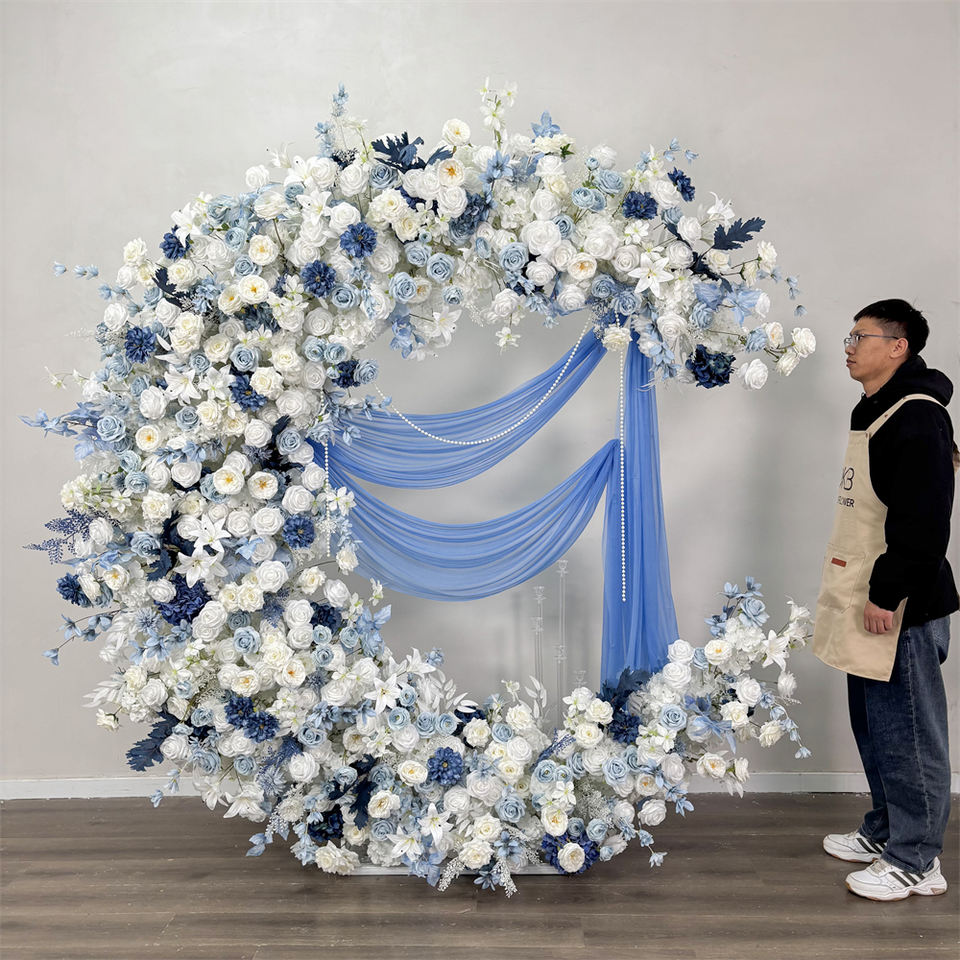 ซุ้มดอกไม้ประดิษฐ์รูปพระจันทร์สีน้ำเงินคุณภาพสูงสัมผัสเหมือนจริง ทำจากผ้าไหม สำหรับตกแต่งงานแต่งงานและวันแม่