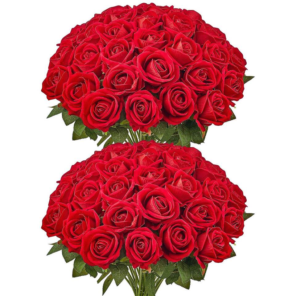 ช่อดอกไม้ประดิษฐ์กุหลาบแดง60ชิ้นที่สมจริงสำหรับตกแต่งบ้านในเทศกาลคริสต์มาส