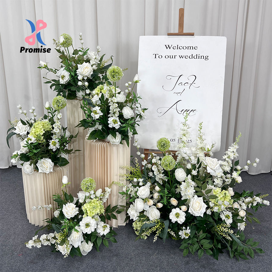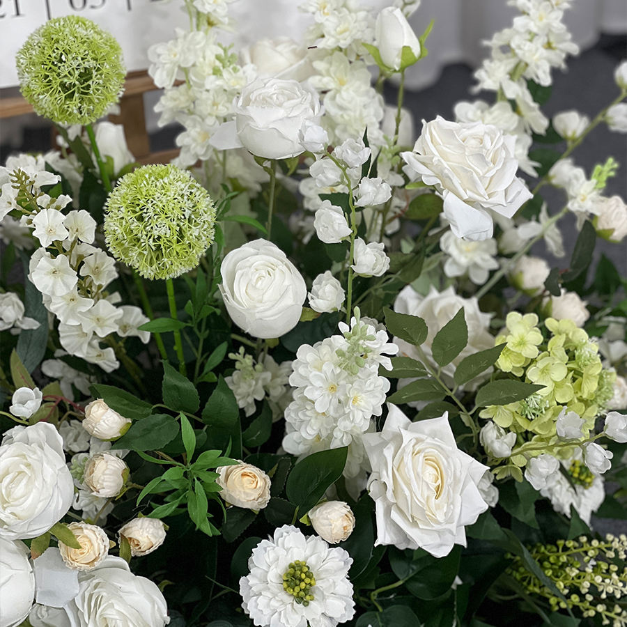 ช่อดอกไฮเดรนเยียและกุหลาบผ้าไหมสีขาวและเขียวเสมือนจริง สำหรับตกแต่งโต๊ะงานแต่งงานสุดหรู