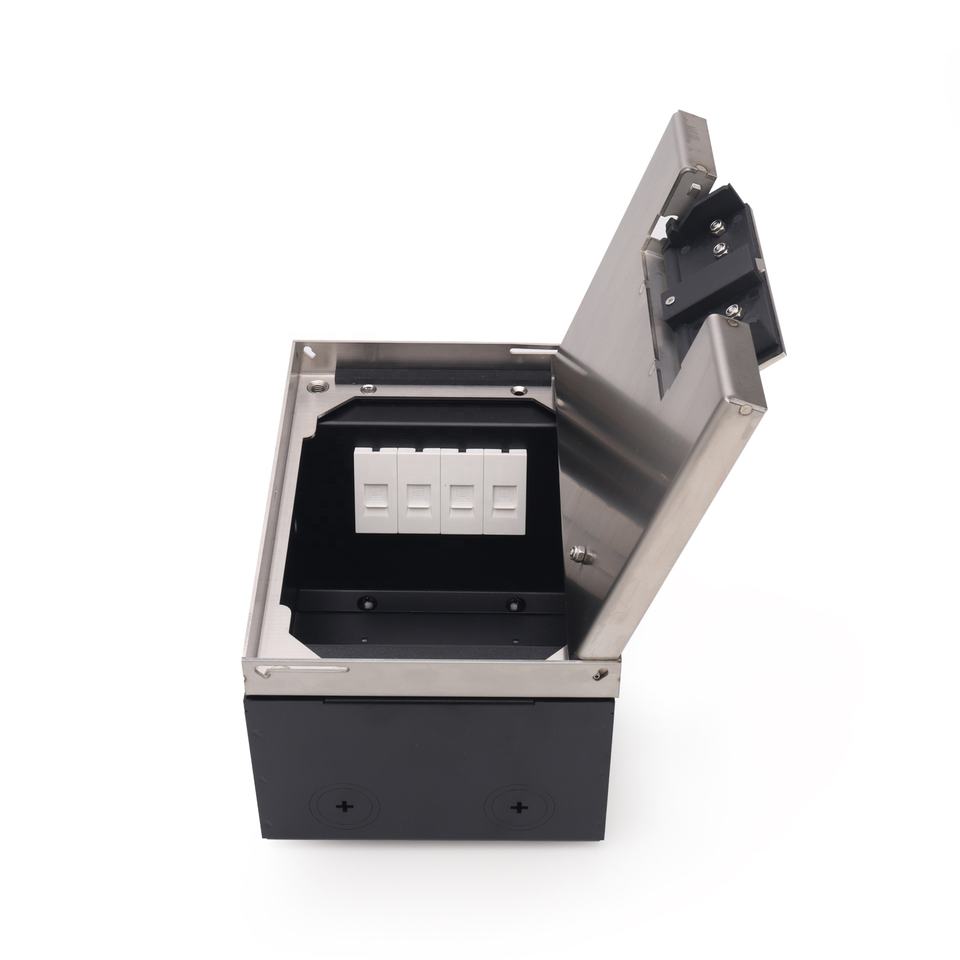 กล่องพื้นสแตนเลสแบบฝังพร้อมระบบจัดการสายเคเบิลและฝาปิดช่องเสียบสายไฟแบบล็อคตัวเอง