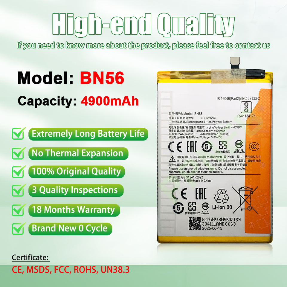แบตเตอรี่โทรศัพท์แบบชาร์จไฟได้สำหรับ9C 9A Xiaomi redmi Note แบตเตอรี่ลิเธียม BN56 3.85V 4900mAh รับประกัน18เดือน