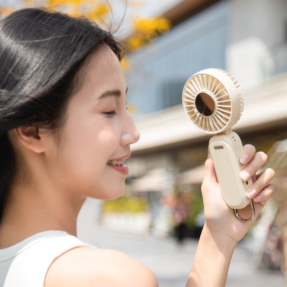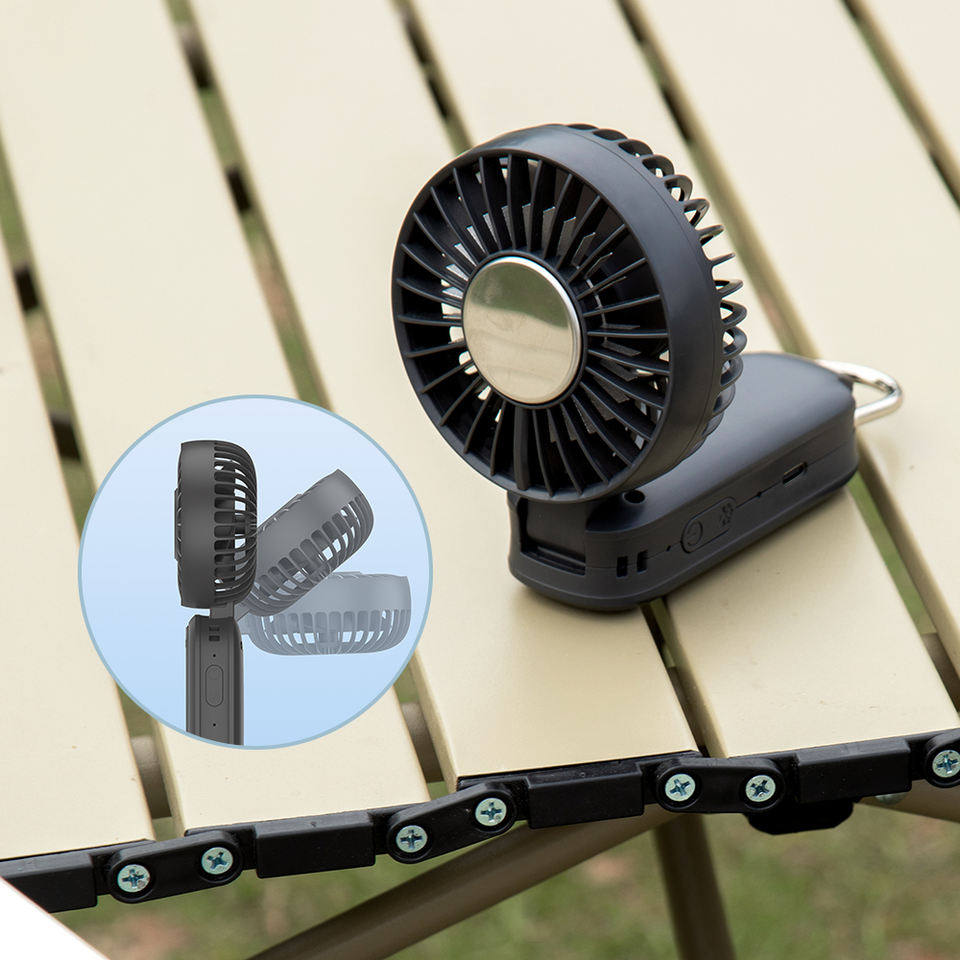 พัดลมพกพาขนาดเล็กแบบชาร์จไฟได้ พัดลมมือถือคุณภาพสูงพร้อมฟังก์ชั่นทำความเย็นและตัวล็อคสำหรับปีนเขา หัวพัดลมพับได้