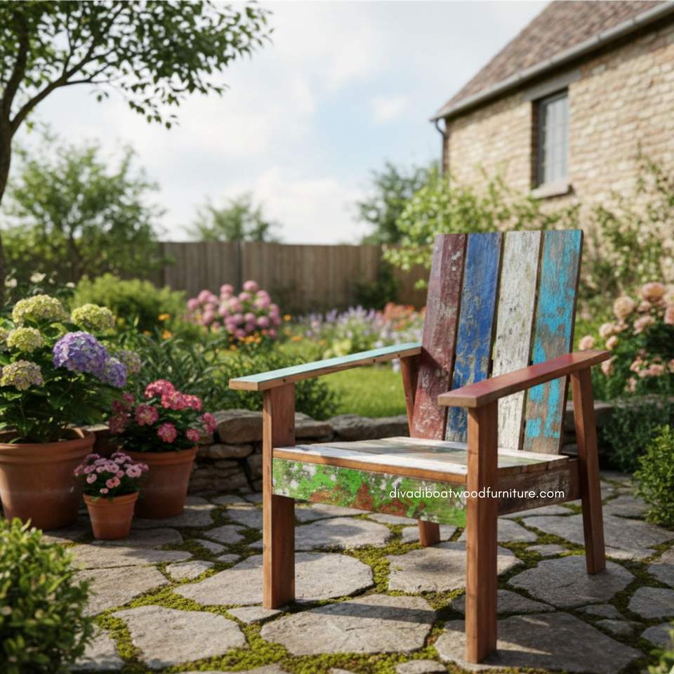 เก้าอี้ไม้เรือรีเคลมสีธรรมชาติ พร้อมพนักพิงและที่วางแขน สำหรับสวน ระเบียง ภายนอกและภายในบ้าน เฟอร์นิเจอร์แบบถอดประกอบได้