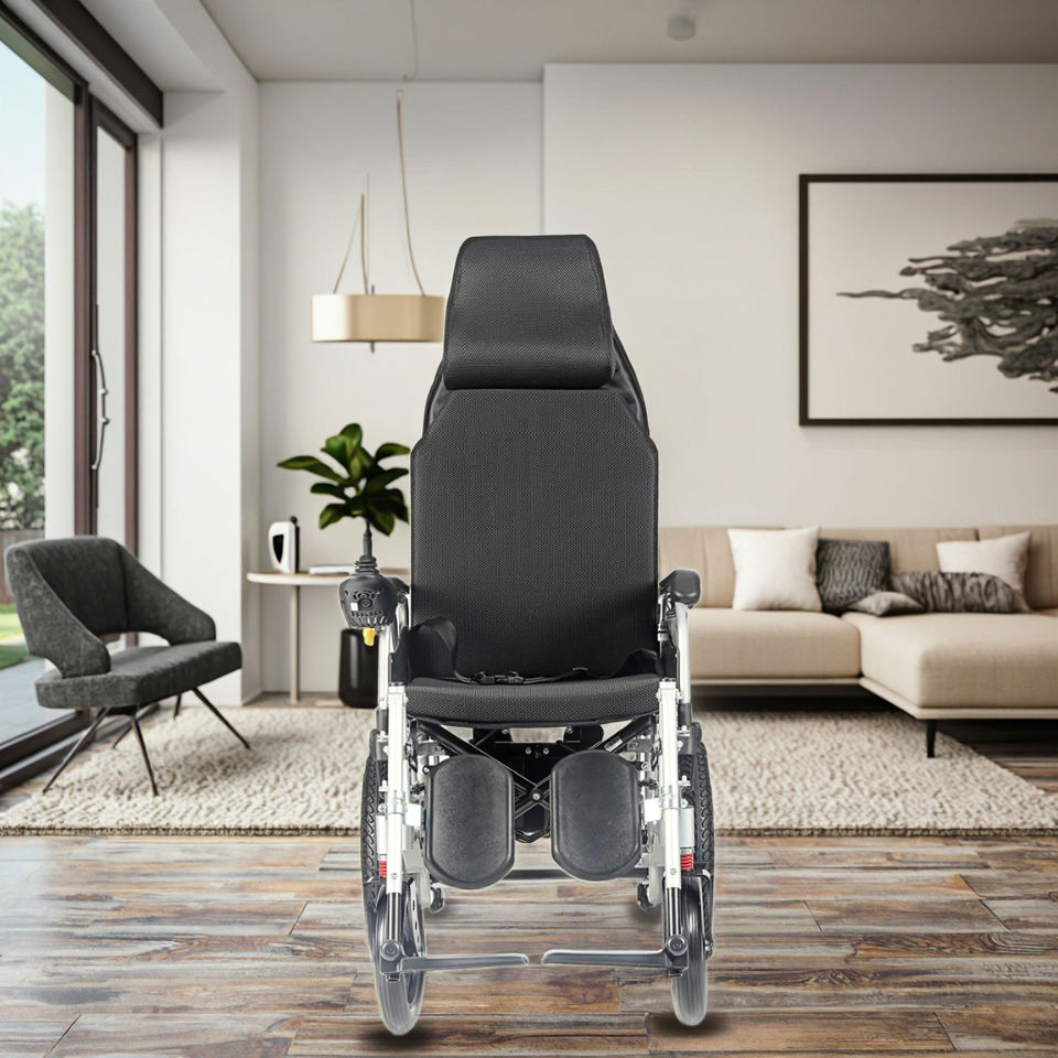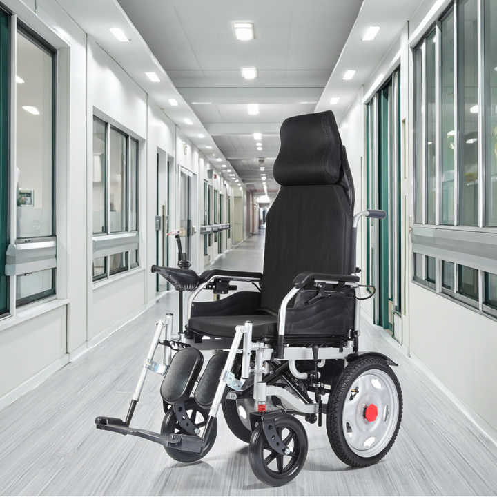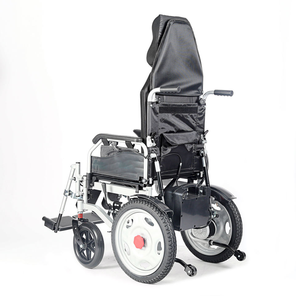 เก้าอี้รถเข็นไฟฟ้าปรับเอนได้สำหรับผู้ใหญ่ดีไซน์ตามหลักสรีรศาสตร์พร้อมที่วางหลังและขาหลายตำแหน่ง