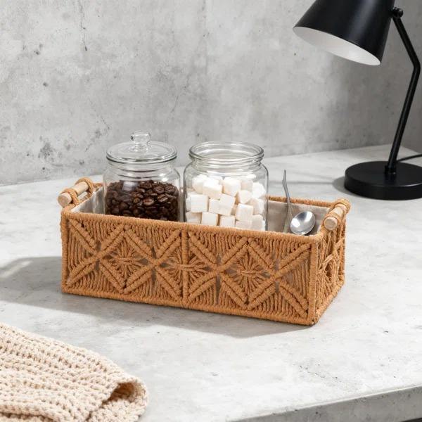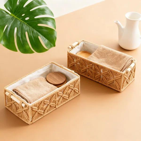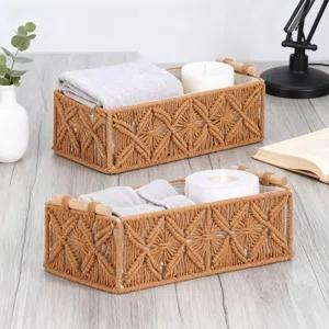 ตะกร้าสานสีน้ำตาลทรงสี่เหลี่ยมผืนผ้า เหมาะสำหรับจัดเก็บของในห้องน้ำ ใช้เป็นที่จัดระเบียบโต๊ะเครื่องแป้ง และตกแต่งบ้านอย่างมีสไตล์ พร้อมดีไซน์ที่ใช้งานได้จริง