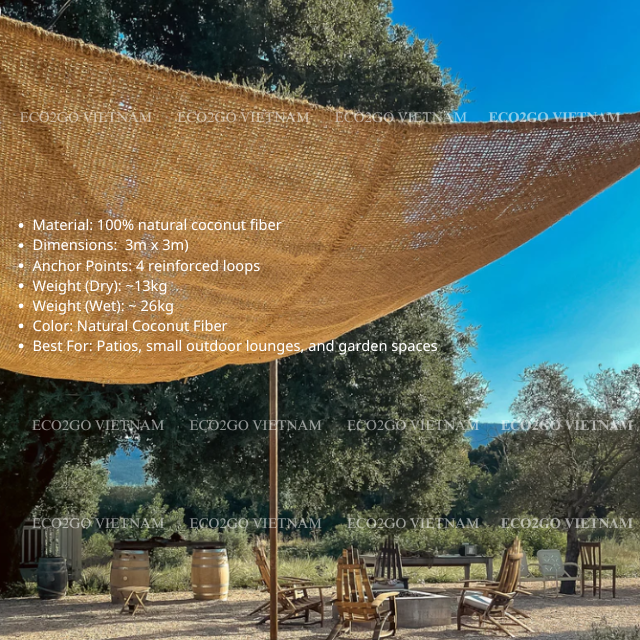 ร่มบังแดดใยมะพร้าวทรงสี่เหลี่ยมพร้อมห่วงโลหะสำหรับใช้ชายหาดและสวนหลังบ้าน คุณภาพสูง Eco2go เวียดนาม