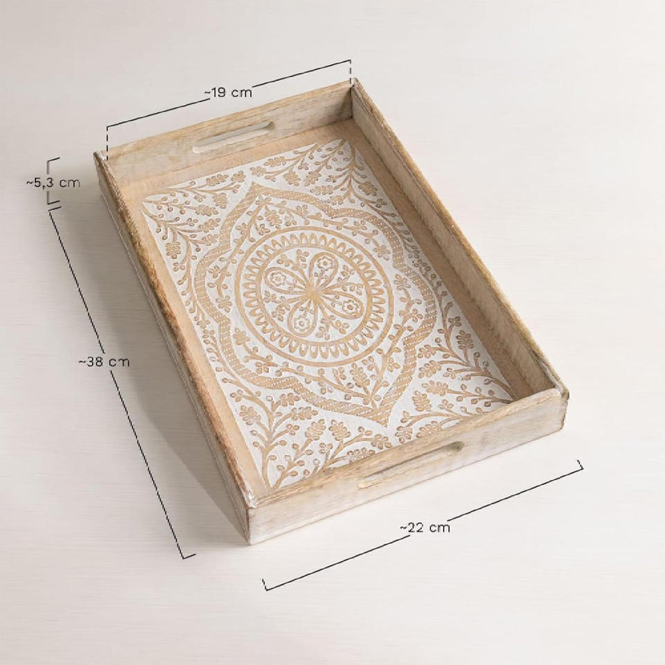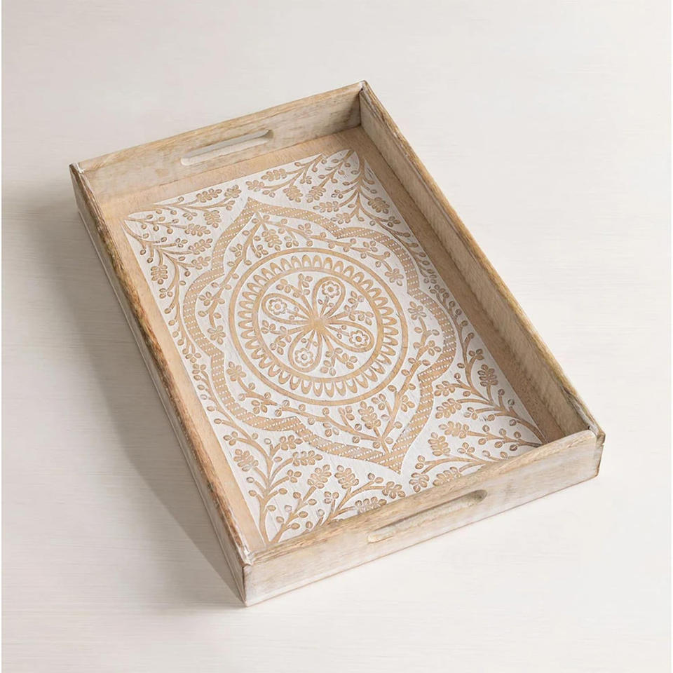 ถาดไม้มะม่วงทรงสี่เหลี่ยมผืนผ้า งานฝีมือพร้อมหูจับ เหมาะสำหรับเสิร์ฟ ตกแต่งบ้าน โต๊ะกาแฟแบบออตโตมัน และใช้สำหรับขายส่ง
