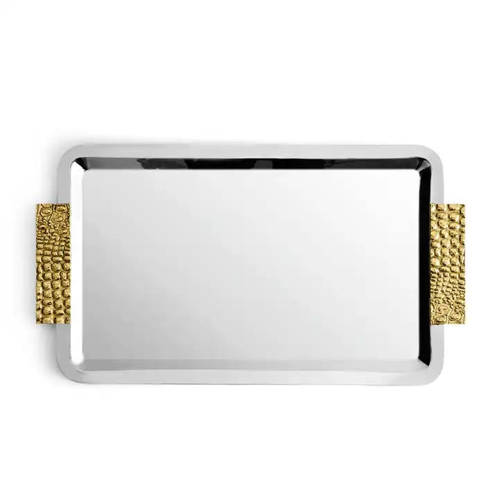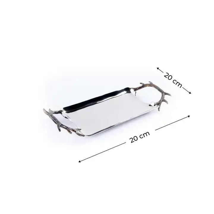 ถาดเสิร์ฟอาหารโลหะทรงสี่เหลี่ยมผืนผ้าพร้อมด้ามจับสีเงินสำหรับวางบนโต๊ะในงานแต่งงานงานอาหารว่างและเครื่องดื่ม