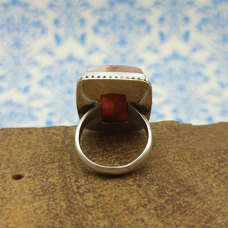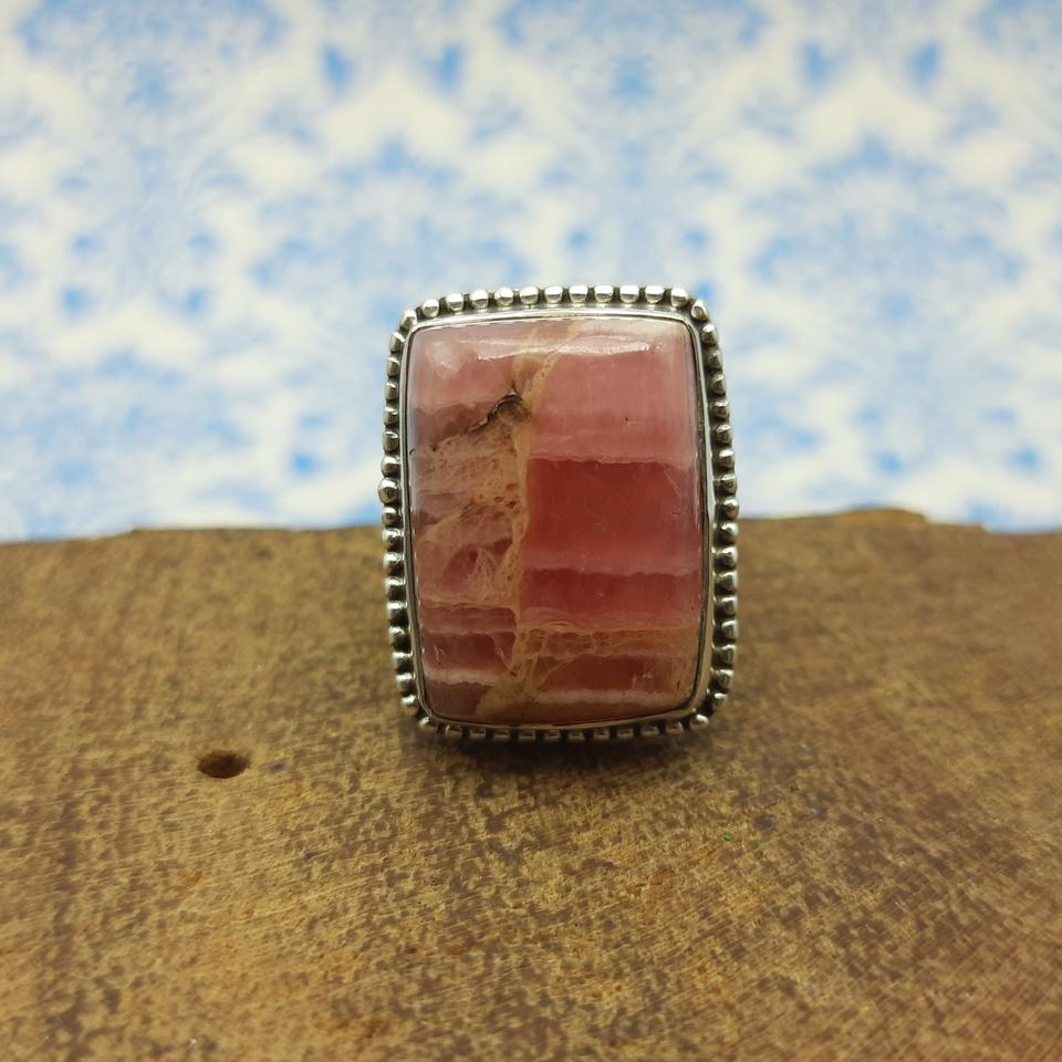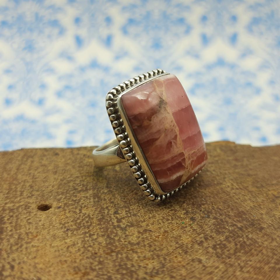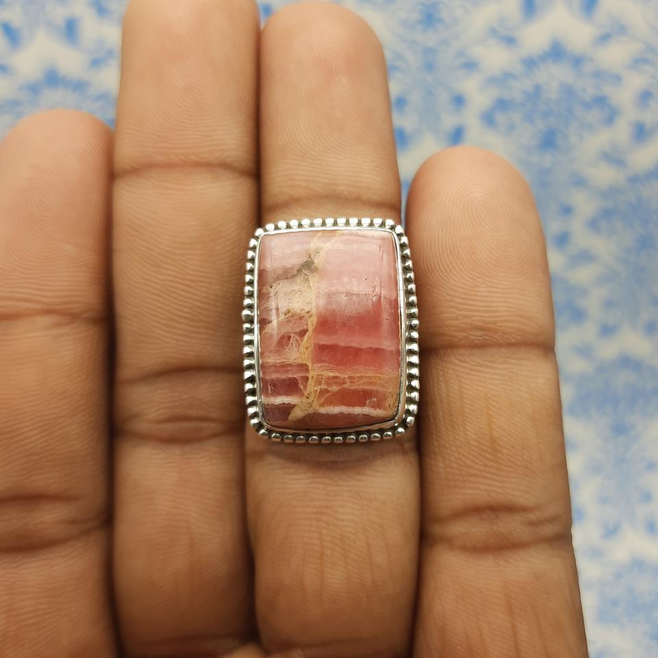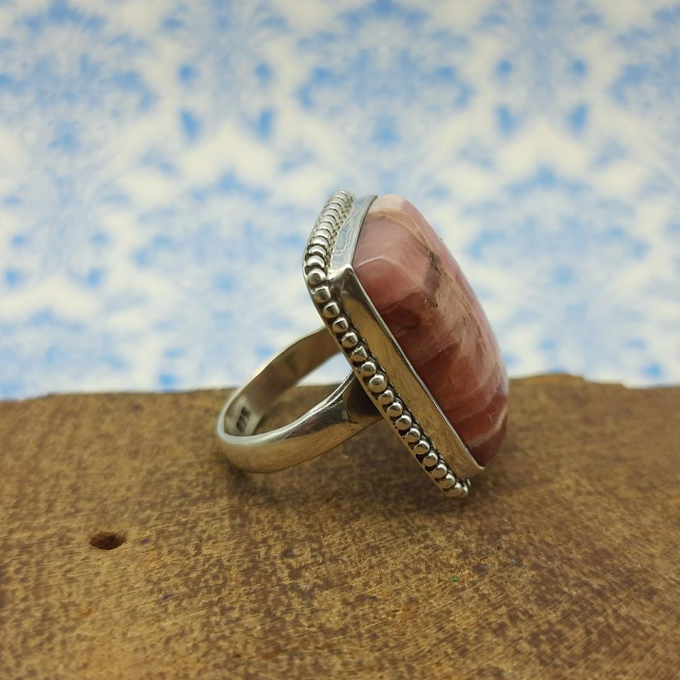 925พลอยโรโดโครไซต์ทรงสี่เหลี่ยมผืนผ้าแหวนเงินสเตอริงแข็งพร้อมเนบาลีทำงาน