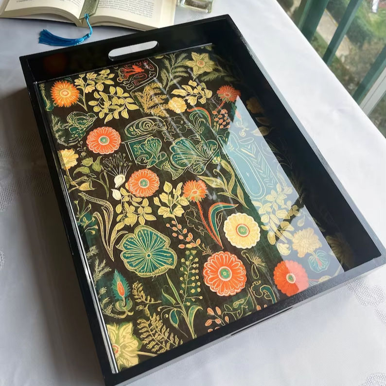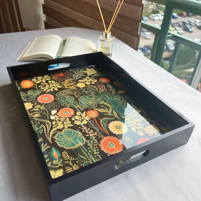 ถาดเสิร์ฟไม้ทรงสี่เหลี่ยมพร้อมหูจับ งานศิลปะอีพ็อกซี่ ตกแต่งโต๊ะกาแฟสไตล์เรสติก