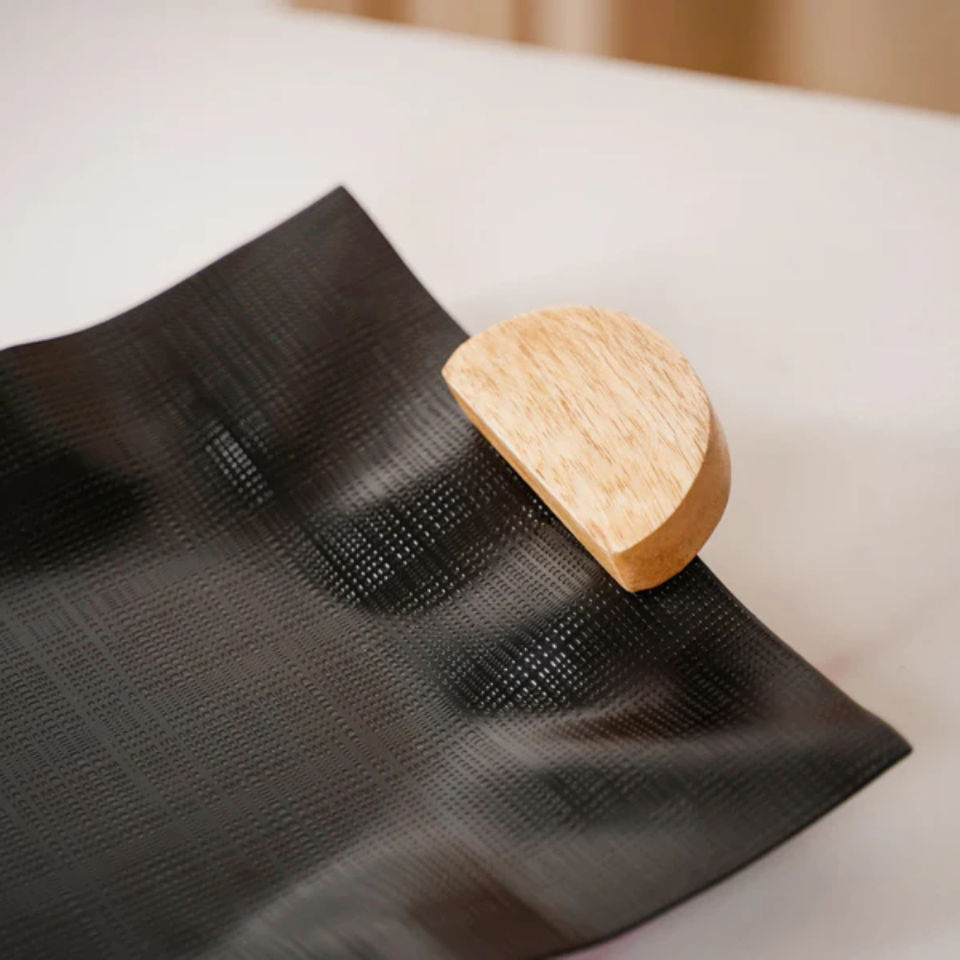 ถาดโลหะสี่เหลี่ยมสีดำพร้อมที่จับไม้ถาดเสิร์ฟสำหรับโต๊ะอาหารและจานตกแต่งอาหารเช้าทันสมัย