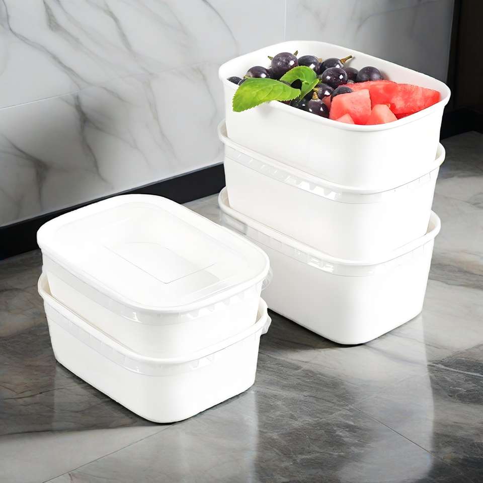 ชามใส่สลัดอาหารกลางวันกระดาษสีขาวทรงสี่เหลี่ยมขนาดกำหนดเองได้ชามกระดาษสีขาวพร้อมฝาพลาสติก
