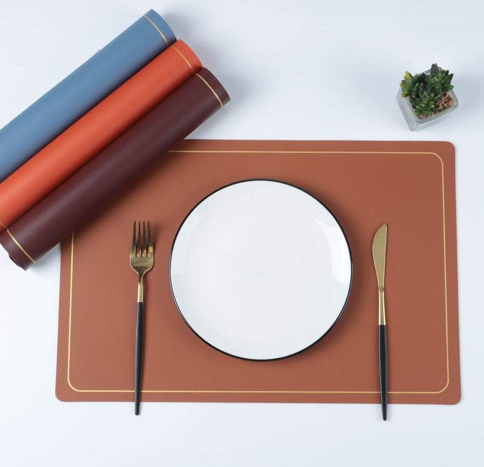 แผ่นรองจานหนัง PU รูปทรงสี่เหลี่ยมผืนผ้า เช็ดทำความสะอาดได้ สำหรับงานเทศกาล ตกแต่งบ้าน แผ่นรองโต๊ะและแผ่นรองอาหารแบบกำหนดเองได้ สำหรับโต๊ะกาแฟและโต๊ะรับประทานอาหาร