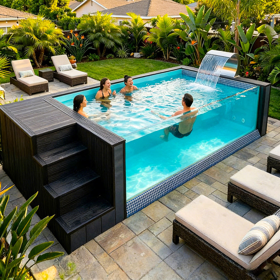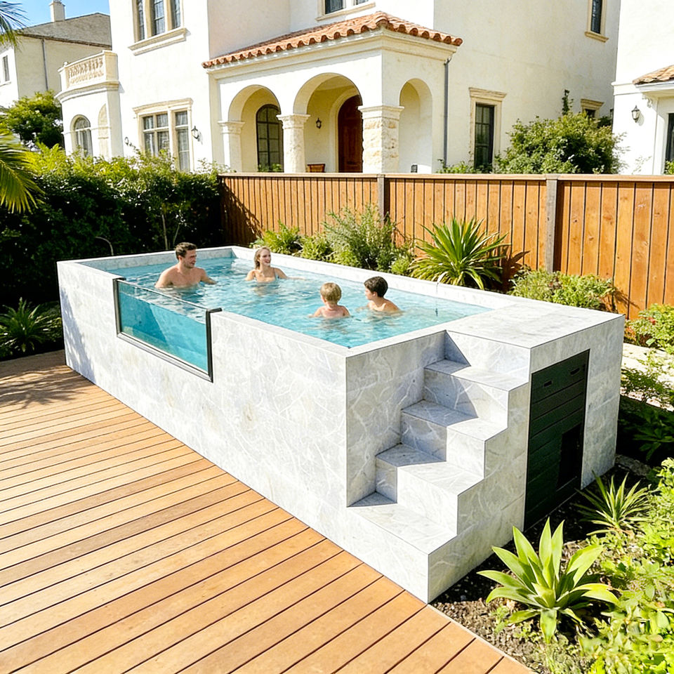 สระว่ายน้ำทรงสี่เหลี่ยมแบบตั้งอิสระสำหรับวิลล่า ใช้หน้าต่างอะคริลิกสำหรับชมวิว สระว่ายน้ำไฟเบอร์กลาสแบบคอนเทนเนอร์