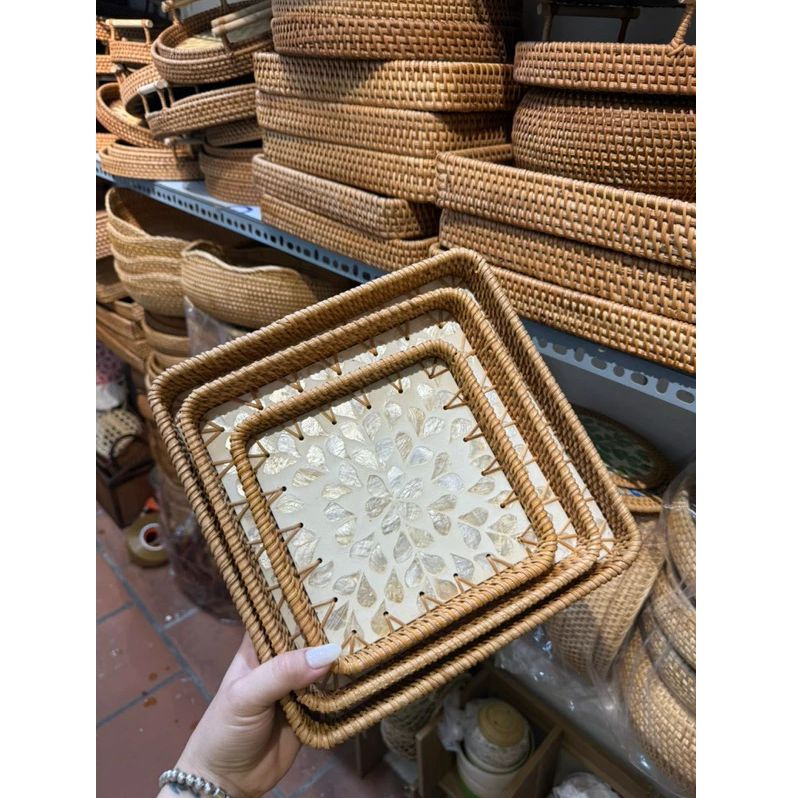 ถาดหวายทรงสี่เหลี่ยมผืนผ้า ประดับเปลือกหอยมุกและลายมุก สำหรับใส่ภาชนะบนโต๊ะอาหาร ใช้จัดเก็บ และตกแต่ง