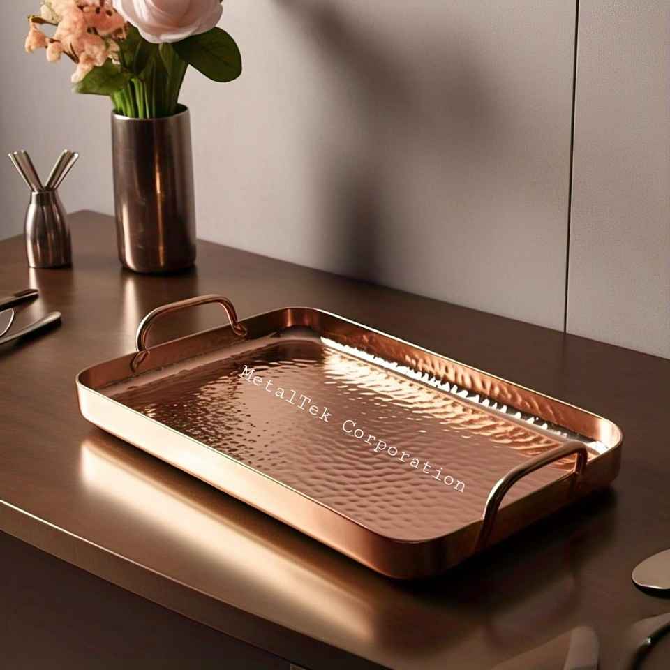 ถาดเสิร์ฟอาหารทรงสี่เหลี่ยมผืนผ้าสีโรสโกลด์ พร้อมหูจับ ดีไซน์ลายตอก ทำจากอะลูมิเนียม สำหรับโรงแรมหรู งานแต่งงาน งานจัดเลี้ยง และของขวัญ