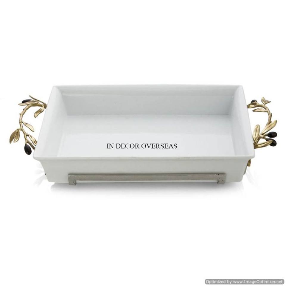 ชามโลหะเคลือบสีขาวทรงสี่เหลี่ยมผืนผ้าพร้อมใบไม้ชุบทองอุปกรณ์วางกลางโต๊ะดีไซน์เนอร์