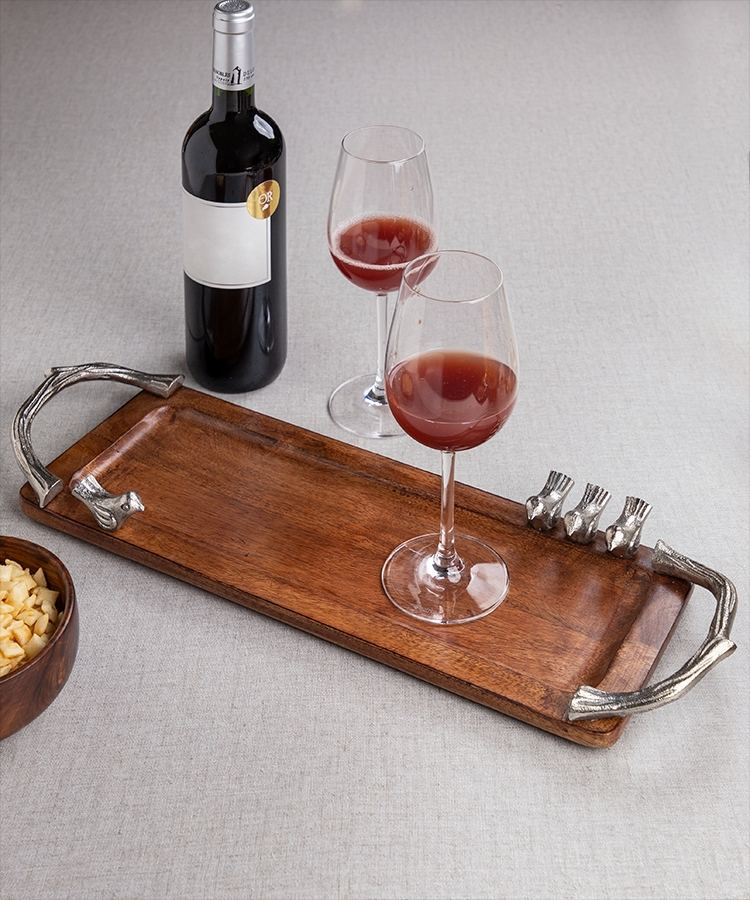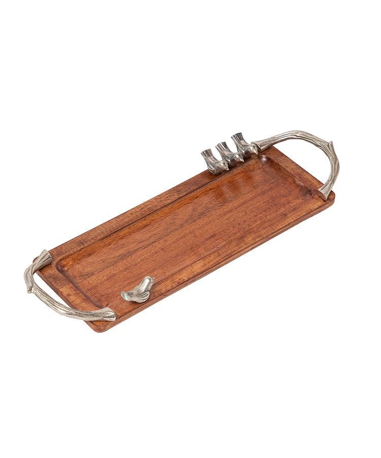ถาดเสิร์ฟไม้ทรงสี่เหลี่ยมผืนผ้า พร้อมหูจับลายกิ่งไม้สีเงินโบราณ และลวดลายรูปนกหล่อขึ้นรูป สำหรับใช้ในบ้านและเป็นของขวัญ