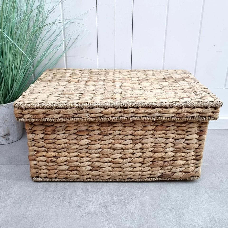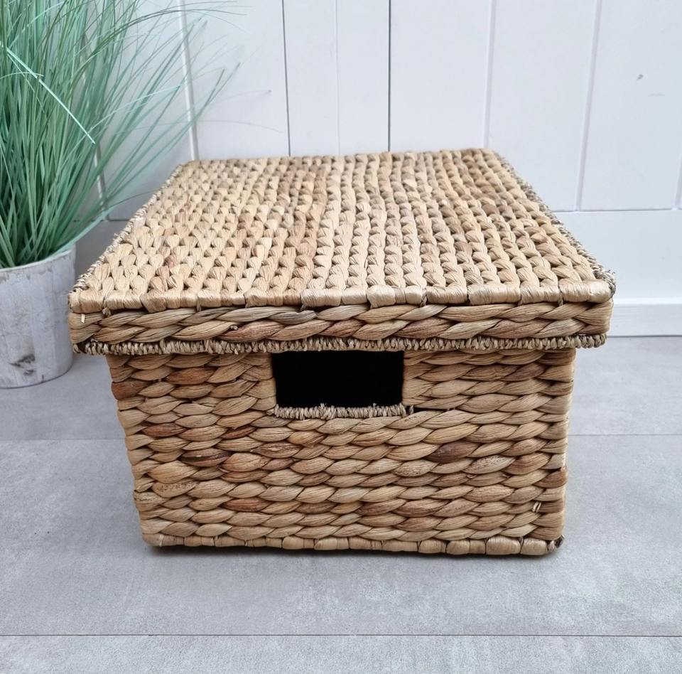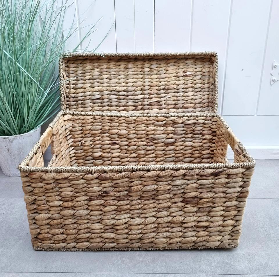 ตะกร้าผักตบชวาทรงสี่เหลี่ยมผืนผ้ามีฝาปิด สานจากหญ้าทะเล
