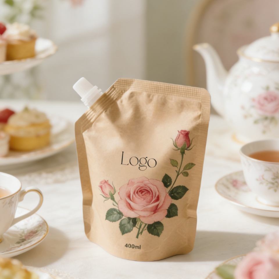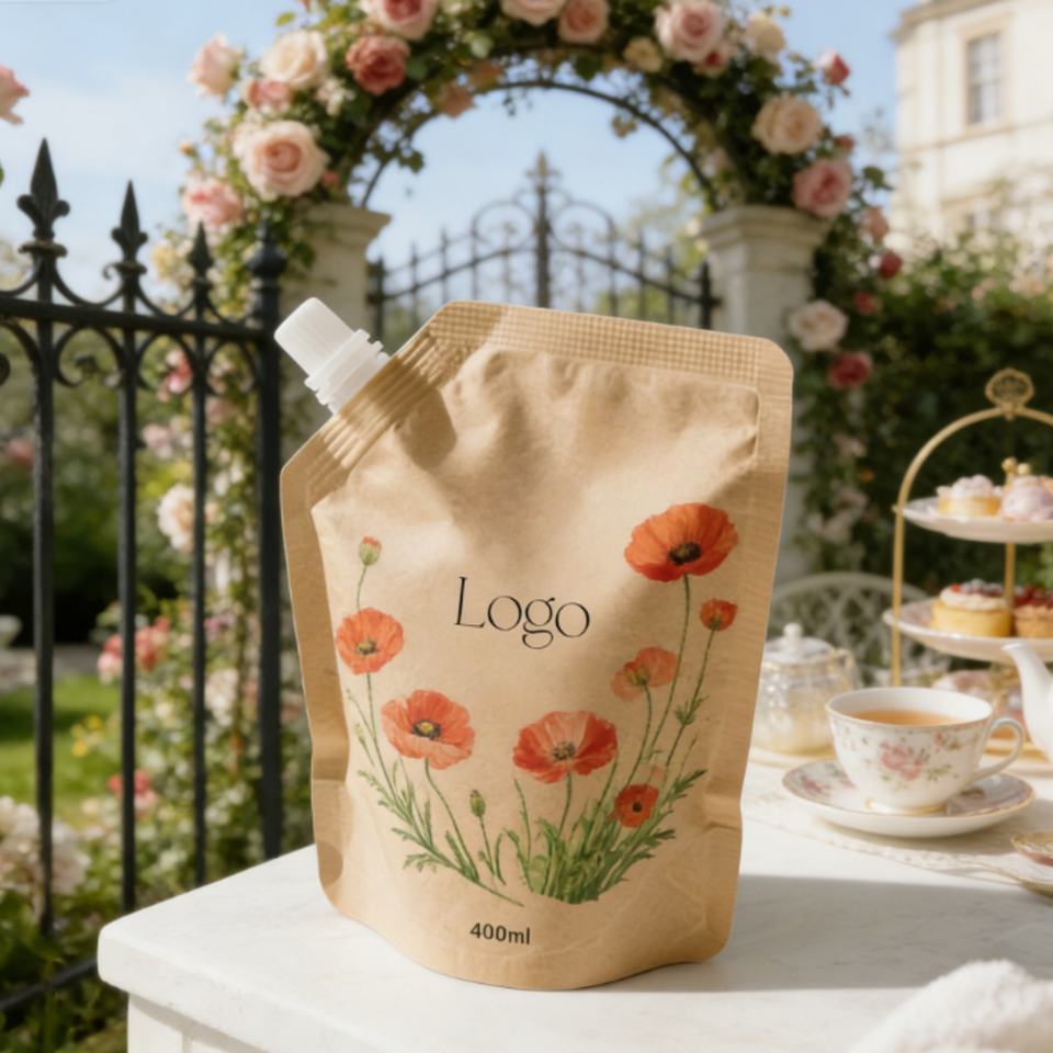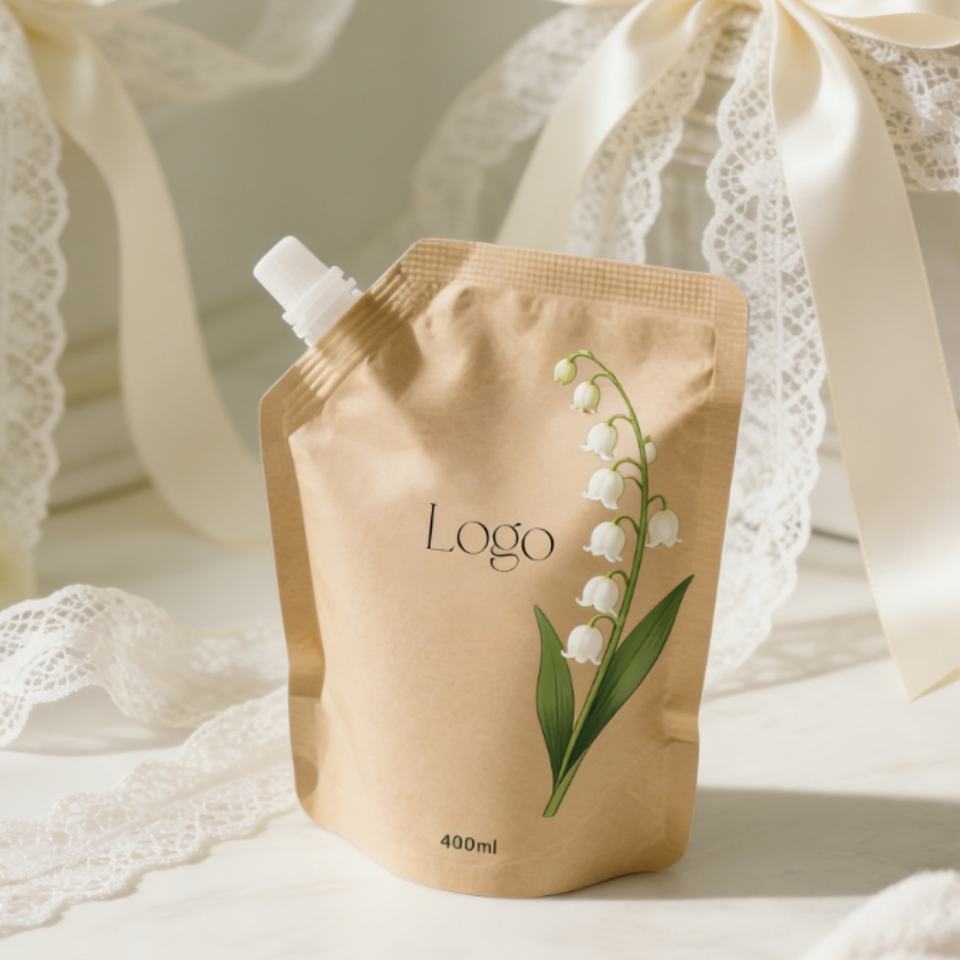 ถุงใส่น้ำมัน/แชมพูแบบมีพวยกา ขนาด 50 มล. 250 มล. 500 มล. ย่อยสลายได้ ผลิตตามสั่ง ทำจากกระดาษคราฟท์สีน้ำตาลแบบตั้งได้