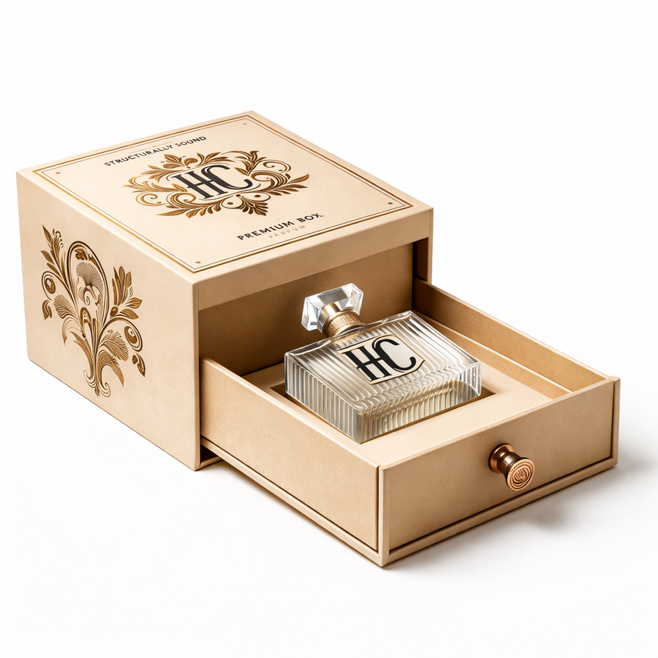 กล่องน้ำหอมแบบพับได้ ผลิตจากกระดาษรีไซเคิล พร้อมแผ่นรองในทำจากเยื่อกระดาษขึ้นรูป สำหรับขายปลีก รับทำโลโก้ตามสั่ง ขายส่ง