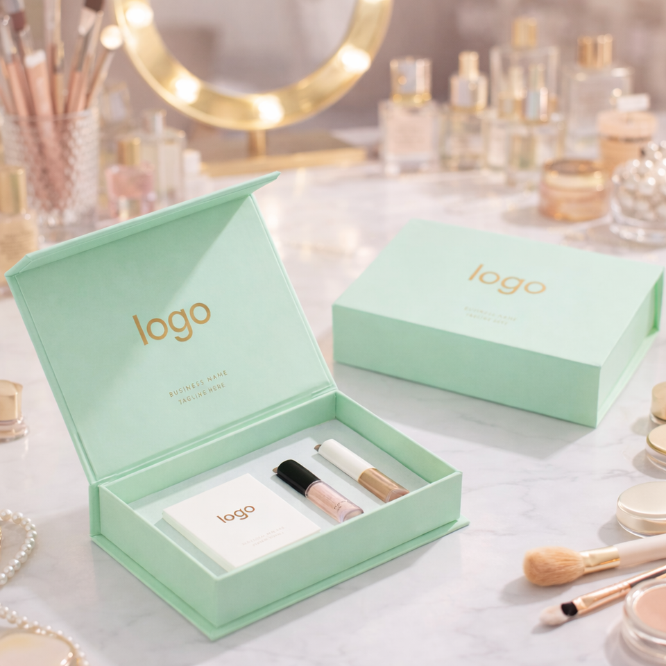 กล่องบรรจุภัณฑ์เครื่องสำอางแบบกำหนดเองรีไซเคิล กล่องของขวัญแม่เหล็กแข็งแรงสำหรับชุดเริ่มต้นแต่งหน้า ปั๊มทอง พิมพ์ลายตามสั่ง ผู้ผลิต
