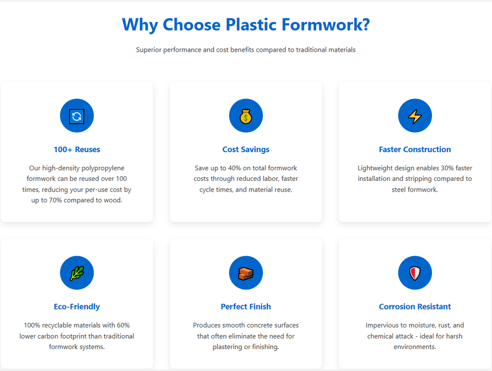 ประกอบได้อย่างง่ายดาย, นำมาใช้ใหม่, ความแข็งแรงสูง, ปรับขนาดได้, การประยุกต์ใช้การขึ้นรูปสากล, เทครั้งเดียวลักษณะ